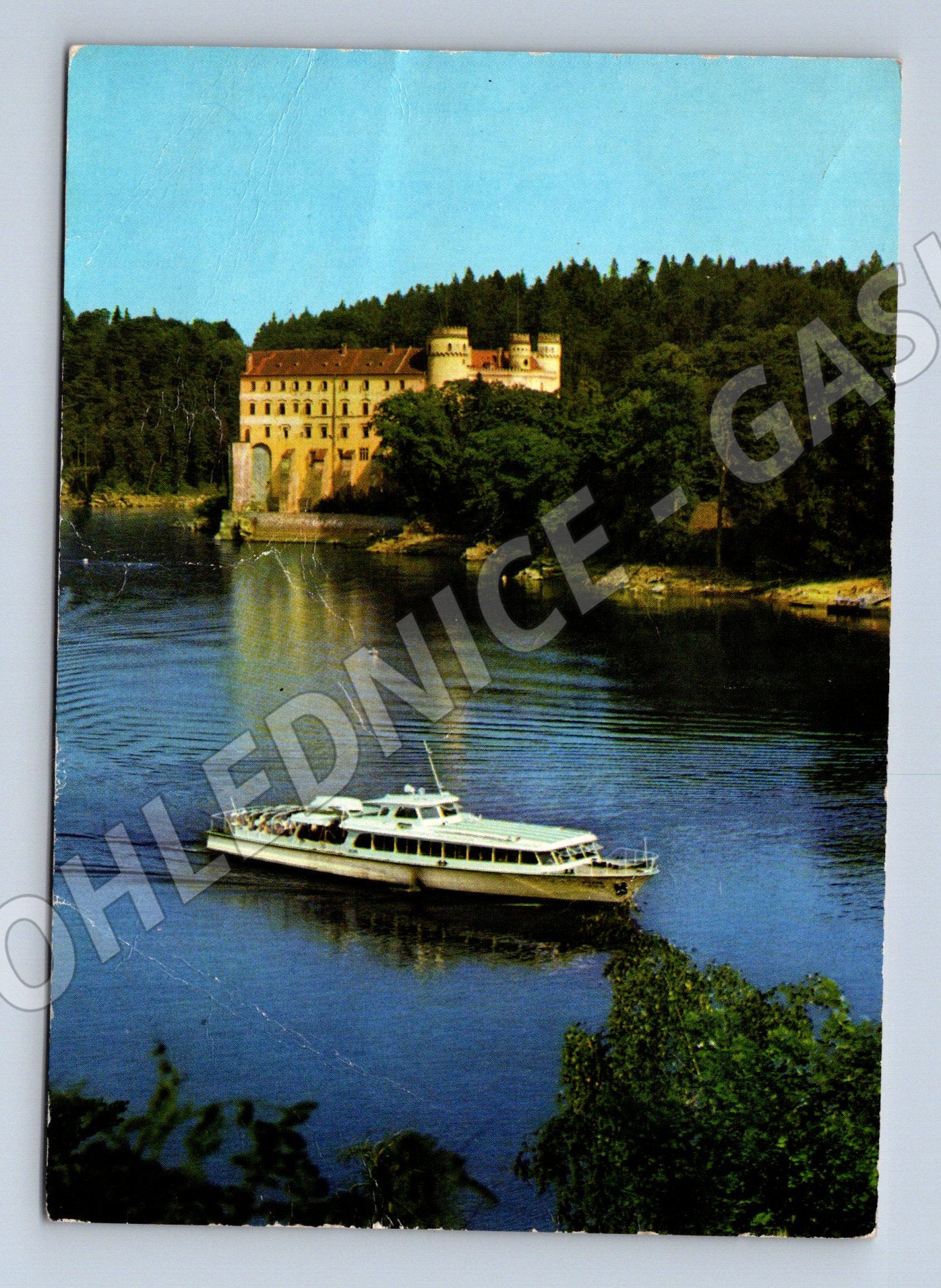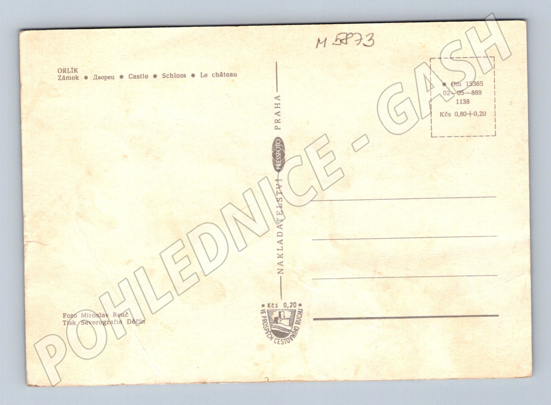 Originální pohlednice zámku Orlík s krásným pohledem na zámek nad Vltavou a projíždějící výletní parník. Pohlednice je vydaná nakladatelstvím Orbis Praha, foto Miroslav Renč, tisk Severografia Děčín. Na zadní straně je vícejazyčný popis (česky, rusky, anglicky, německy, francouzsky). Známky používání a běžné opotřebení, pohlednice nebyla použita – bez textu a známky. Skvělý sběratelský kousek dokumentující jeden z nejznámějších českých zámků a atraktivní turistickou oblast v okolí Orlické přehrady.