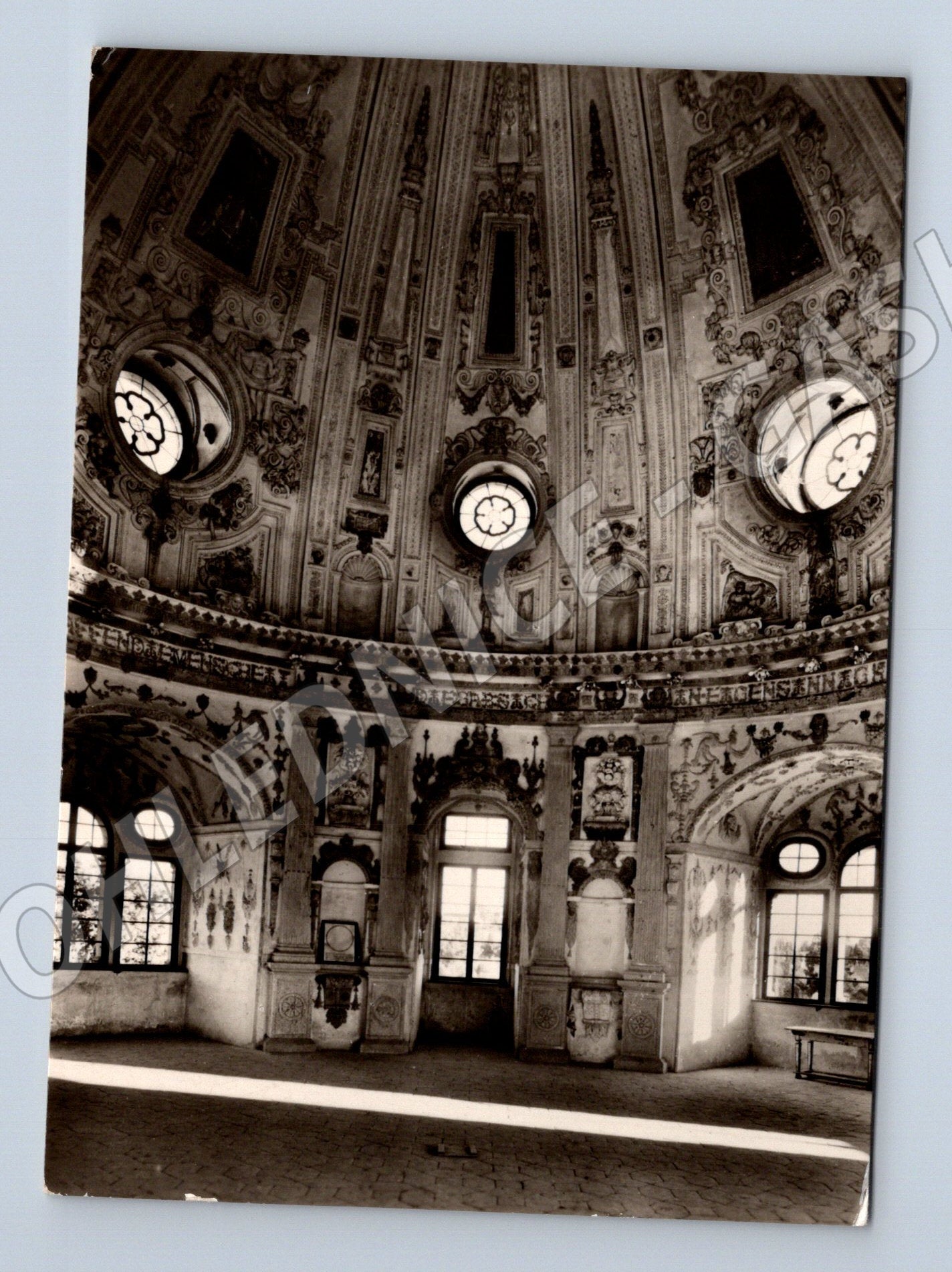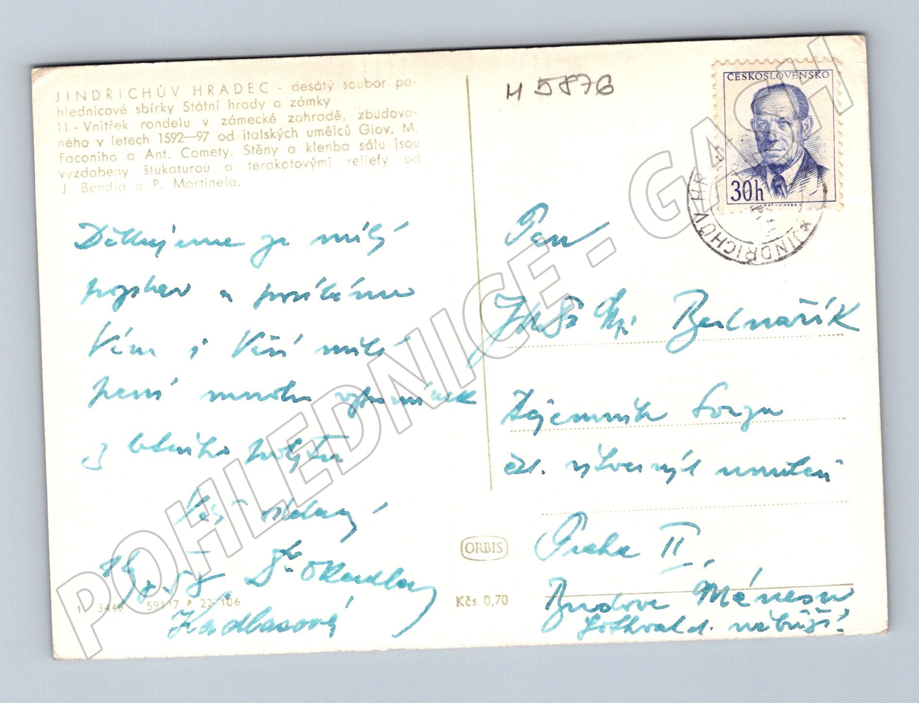 Originální stará pohlednice zobrazující interiér vnitřního rondelu v zámku v Jindřichově Hradci. Jedná se o desátý soubor pohlednicové sbírky Státní hrady a zámky. Rondel byl vybudován v letech 1592–97 pod vedením italských umělců Giov. M. Faconiho a Ant. Cometty, stěny a klenba jsou zdobeny štukaturou a terakotovými reliéfy od J. Bendla a P. Martinela. Na zadní straně je ručně psané věnování a známka s razítkem Jindřichův Hradec. Výborný sběratelský stav, vhodné do sbírky pohlednic historických památek.