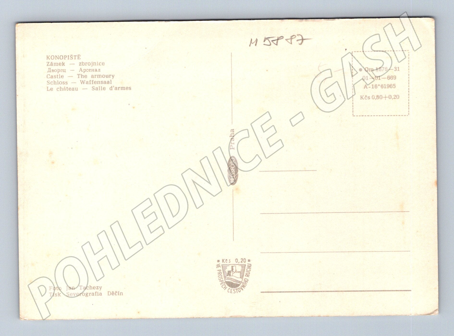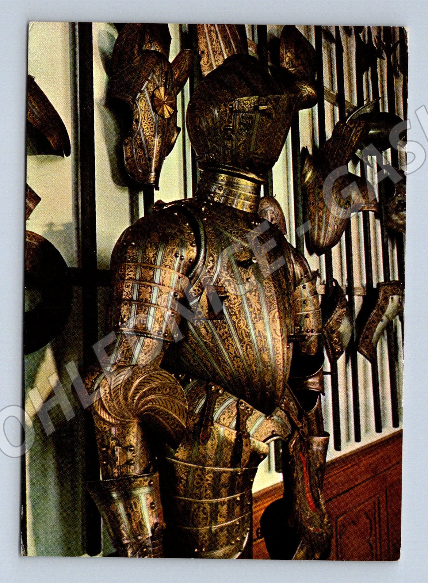 Originální pohlednice ze zbrojnice zámku Konopiště. Na fotografii je detail bohatě zdobené historické zbroje vystavené v interiéru zámku. Zadní strana pohlednice obsahuje popis v několika jazycích a výrobní údaje: Foto Jan Tachezy, tisk Severografia Děčín. Pohlednice je ve velmi dobrém stavu, vhodná do sbírky milovníků hradů, zámků a historických artefaktů.