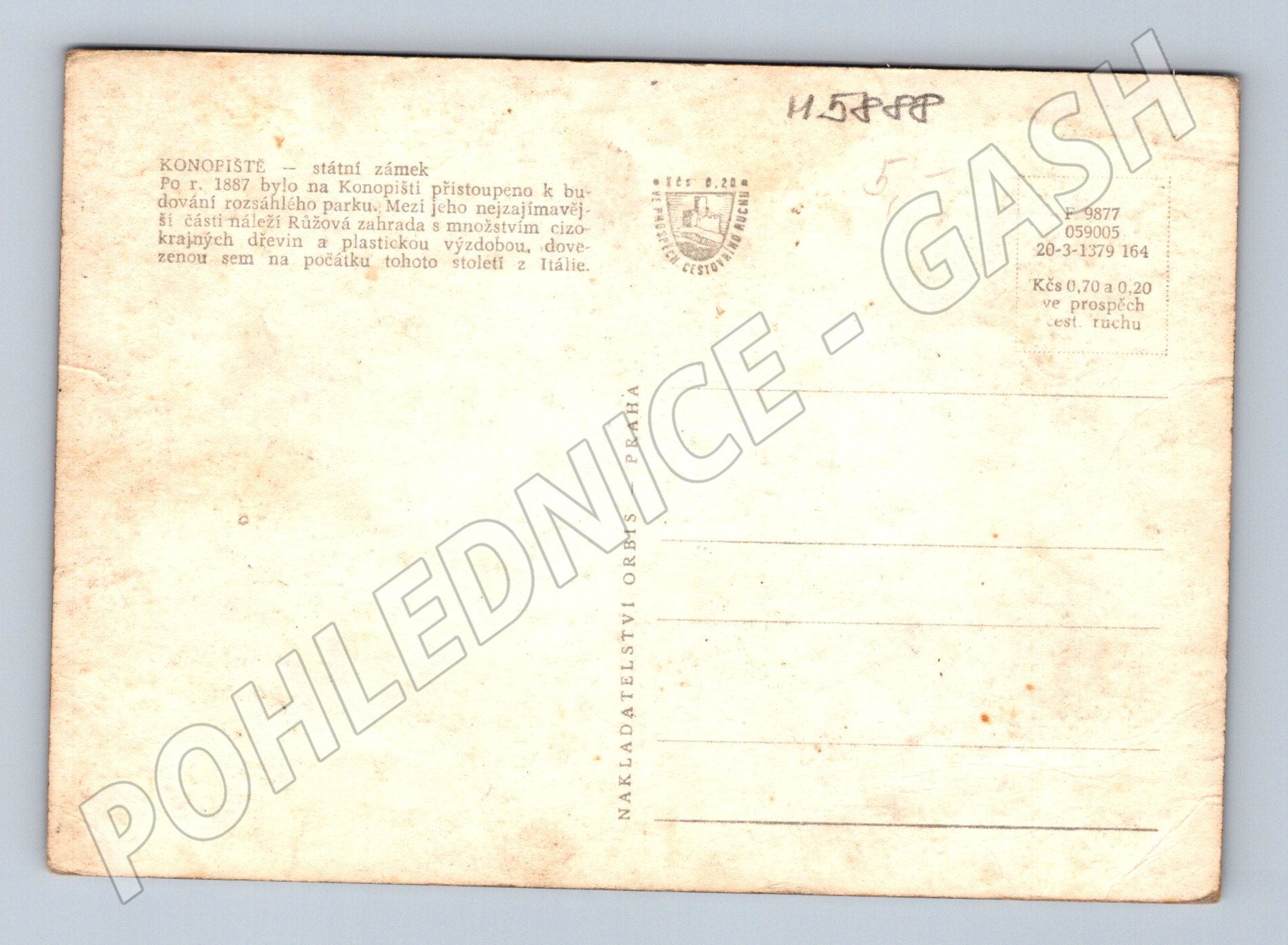 Originální stará pohlednice zobrazující státní zámek Konopiště s přilehlým parkem a Růžovou zahradou. Na fotografii je zachycen zámek z podhledu s množstvím vegetace, zahradní architekturou a ozdobnými prvky. Na zadní straně jsou informace o historii zámku a zajímavostech parku, včetně plastických výzdob a dřevin dovezených z Itálie na začátku 20. století. Pohlednice byla vydána nakladatelstvím Orbis Praha. Stav pohlednice odpovídá stáří – lehce zaoblené rohy, drobné flíčky. Krásný sběratelský kousek vhodný do kolekce pohlednic s hrady a zámky nebo regionální tematikou.