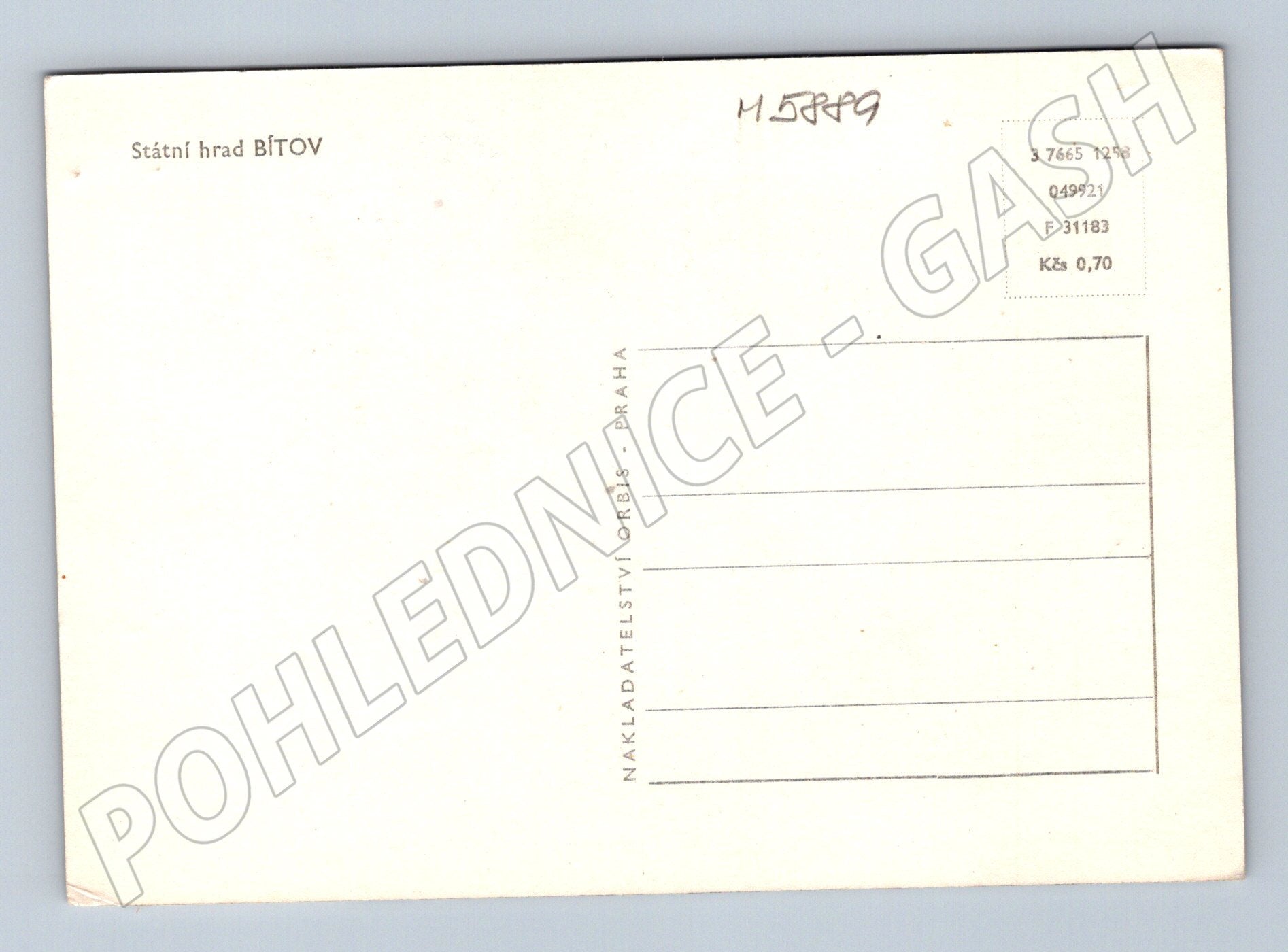 Originální černobílá pohlednice s motivem státního hradu Bítov. Na pohlednici je vyobrazen hrad Bítov na skalnatém ostrohu, obklopený přírodou a řekou, s lodí na vodní hladině. Zadní strana obsahuje text Státní hrad Bítov a předtisk pro adresu a známku. Nakladatelství Orbis – Praha, předpokládané stáří kolem poloviny 20. století. Cena tehdy 0,70 Kčs. Pohlednice je dobře zachovalá, vhodná pro sběratele historických pohlednic s tématem českých hradů a zámků.