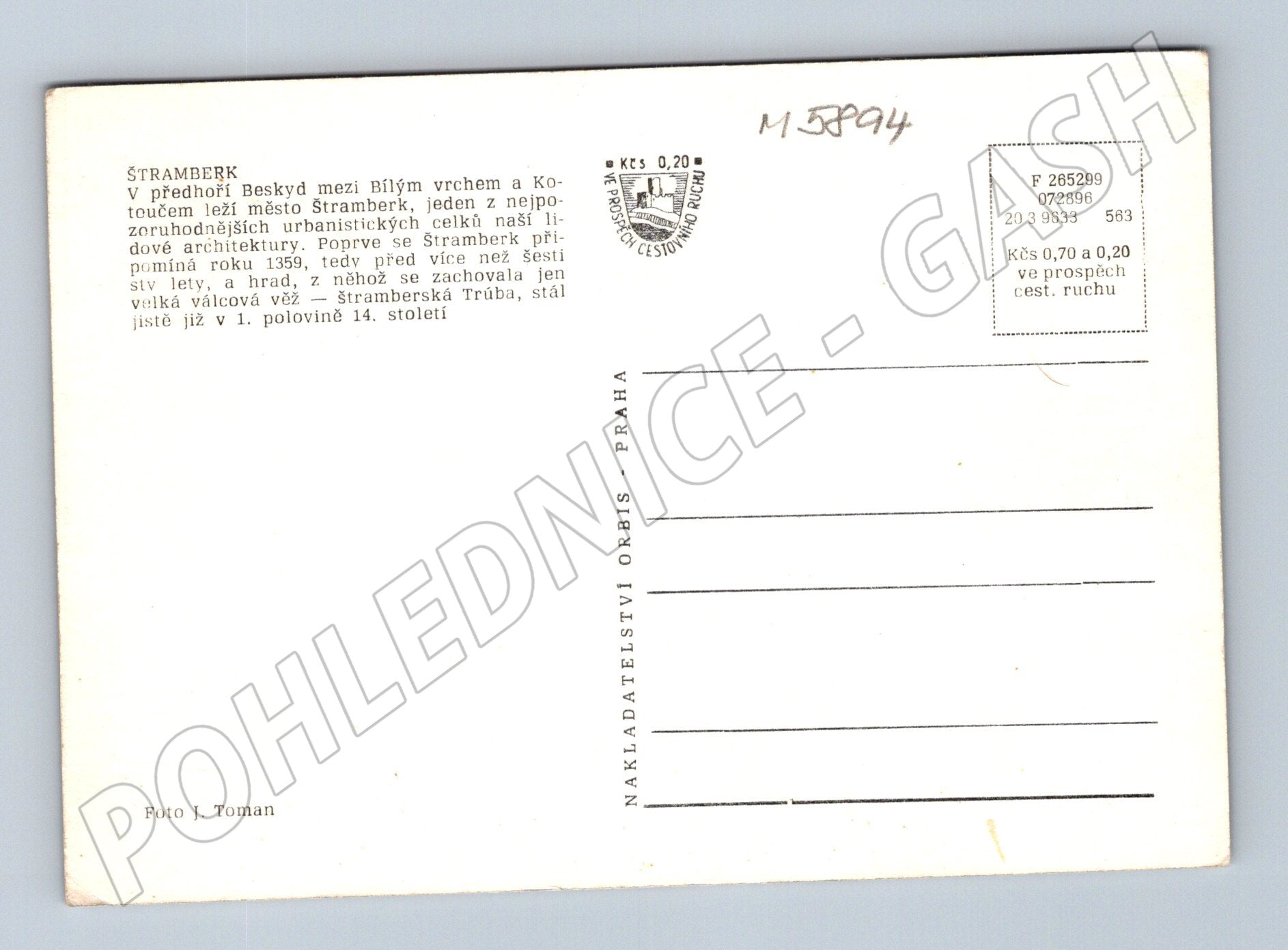 Nabízím originální pohlednici města Štramberk s dominantní Štramberskou Trúbou. Pohlednice zachycuje panorama historického centra města s unikátní hradní věží na kopci. Štramberk, jedno z nejmalebnějších měst podhůří Beskyd, vyniká zachovalou urbanistickou strukturou a malebnou architekturou. Na zadní straně je stručný popis lokality a neprošlé razítko s turistickým motivem. Foto J. Toman. Skvělý sběratelský kousek pro milovníky památek, historie i pohlednic z ČR.