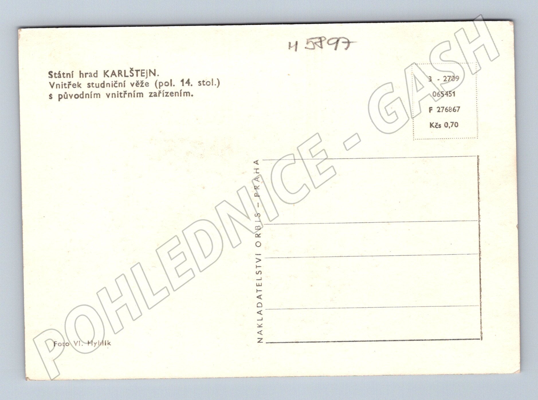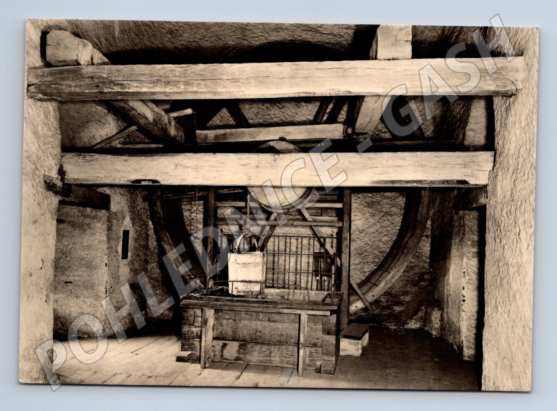 Originální černobílá pohlednice zachycující vnitřek studniční věže státního hradu Karlštejn ze 14. století s původním vnitřním zařízením. Na fotografii je detailně vyobrazeno historické dřevěné soustrojí, které sloužilo k čerpání vody ze studny v hradní věži. Pohlednice pochází z produkce Nakladatelství Orbis, Praha, autorem fotografie je Vl. Hyhlík. Na zadní straně naleznete popis v českém jazyce a vyznačené místo pro adresu a známku. Skvělý sběratelský kousek pro milovníky hradů, technických památek i české historie.