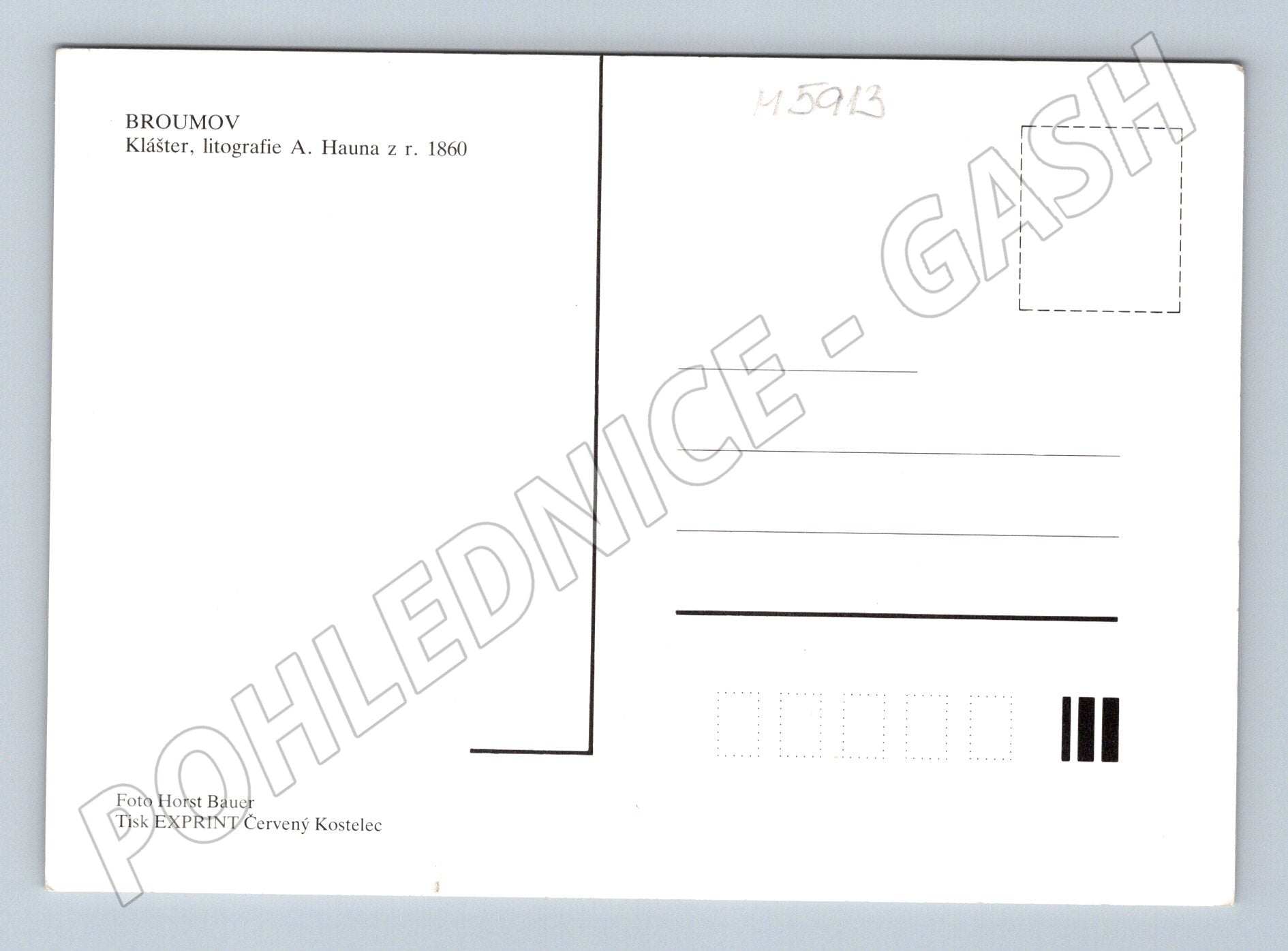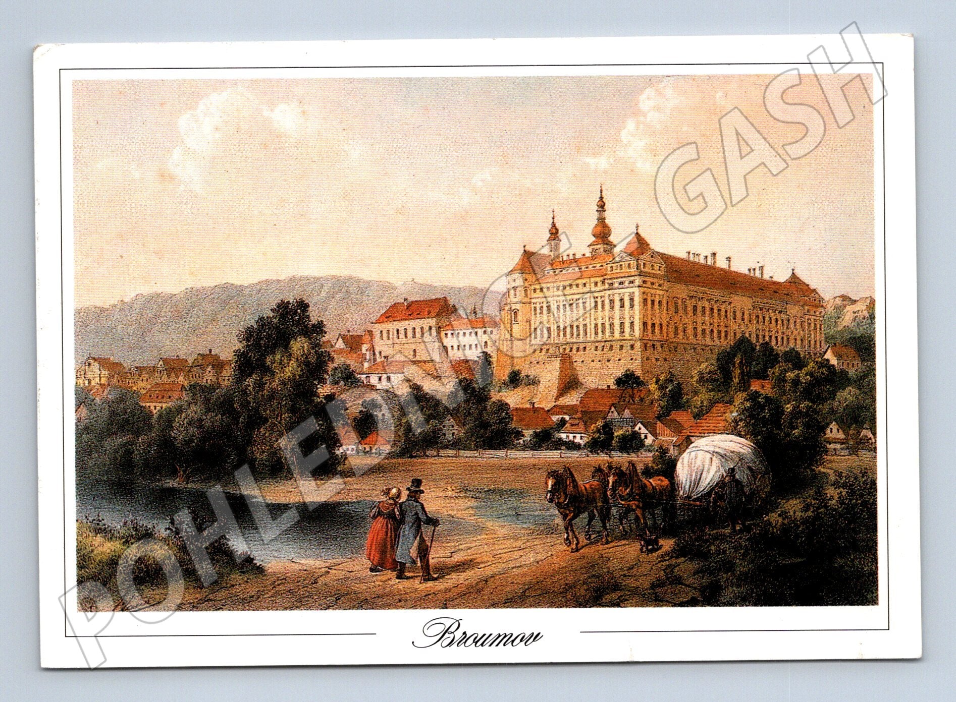 Nabízím pohlednici s motivem broumovského kláštera. Pohlednice je reprodukcí litografie A. Hauna z roku 1860. Na přední straně je detailní pohled na monumentální stavbu kláštera nad městem Broumov, s malebnou krajinou v popředí, koňským povozem a dvěma postavami. Zadní strana je nevyplněná, vhodná ke sběratelským účelům nebo pro další zaslání. Tisk EXPRINT Červený Kostelec, foto Horst Bauer. Velmi pěkný stav, bez poškození. Skvělý přírůstek do sbírky pohlednic s historickými památkami.