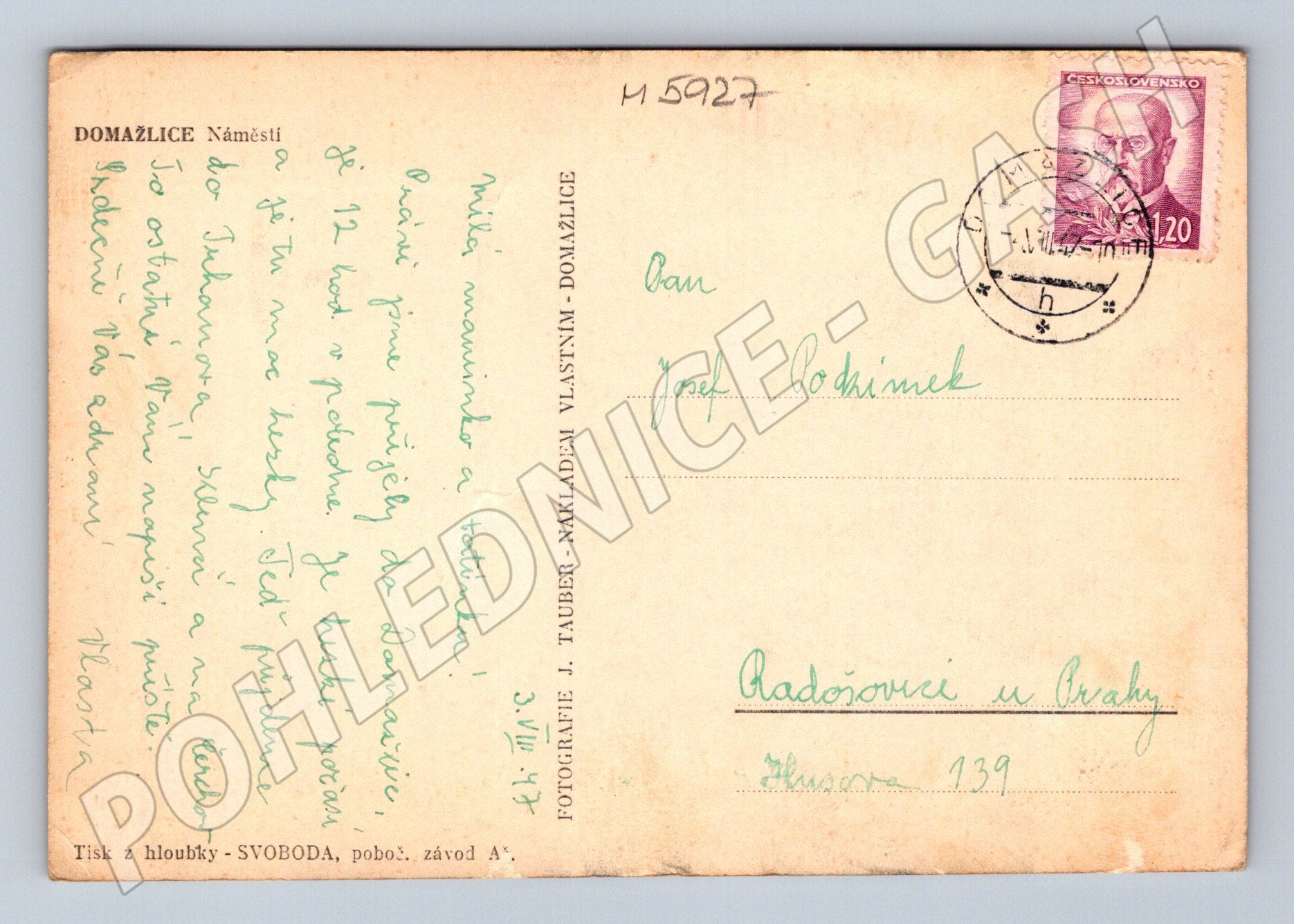 Starý pohled na náměstí v Domažlicích s ikonickou věží, vydaný nakladatelstvím J. Tauber. Pohlednice byla odeslána, na rubu je zachována známka a ručně psaný vzkaz adresovaný panu Josefu Podhnídkovi do Radošovic u Prahy. Datace dle obsahu a použité známky kolem roku 1939. Pohlednice nese znaky oběhu i stáří – mírně zaoblené rohy, drobné opotřebení a patinu času. Formát klasický, černobílá fotografie. Ideální doplněk sbírky historických pohlednic z Čech nebo sběratelům Domažlic.