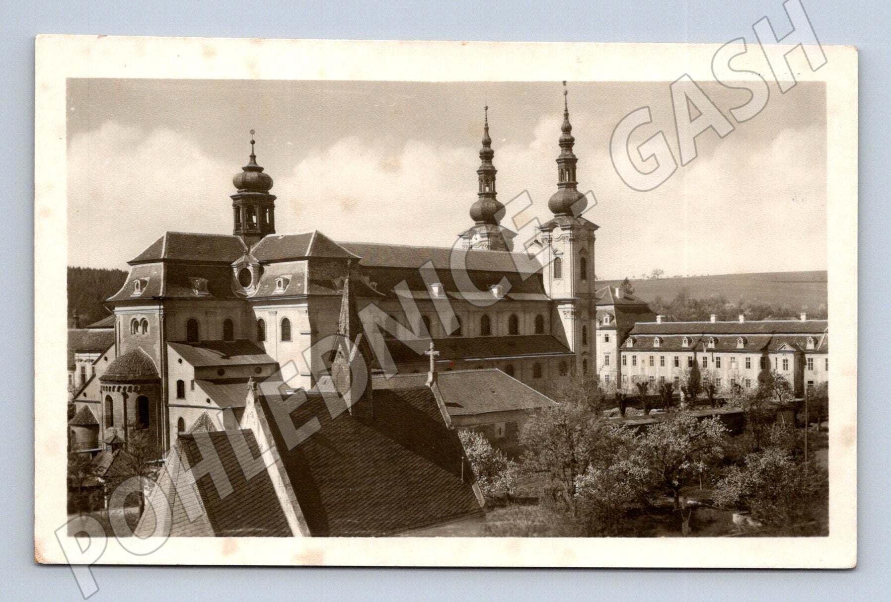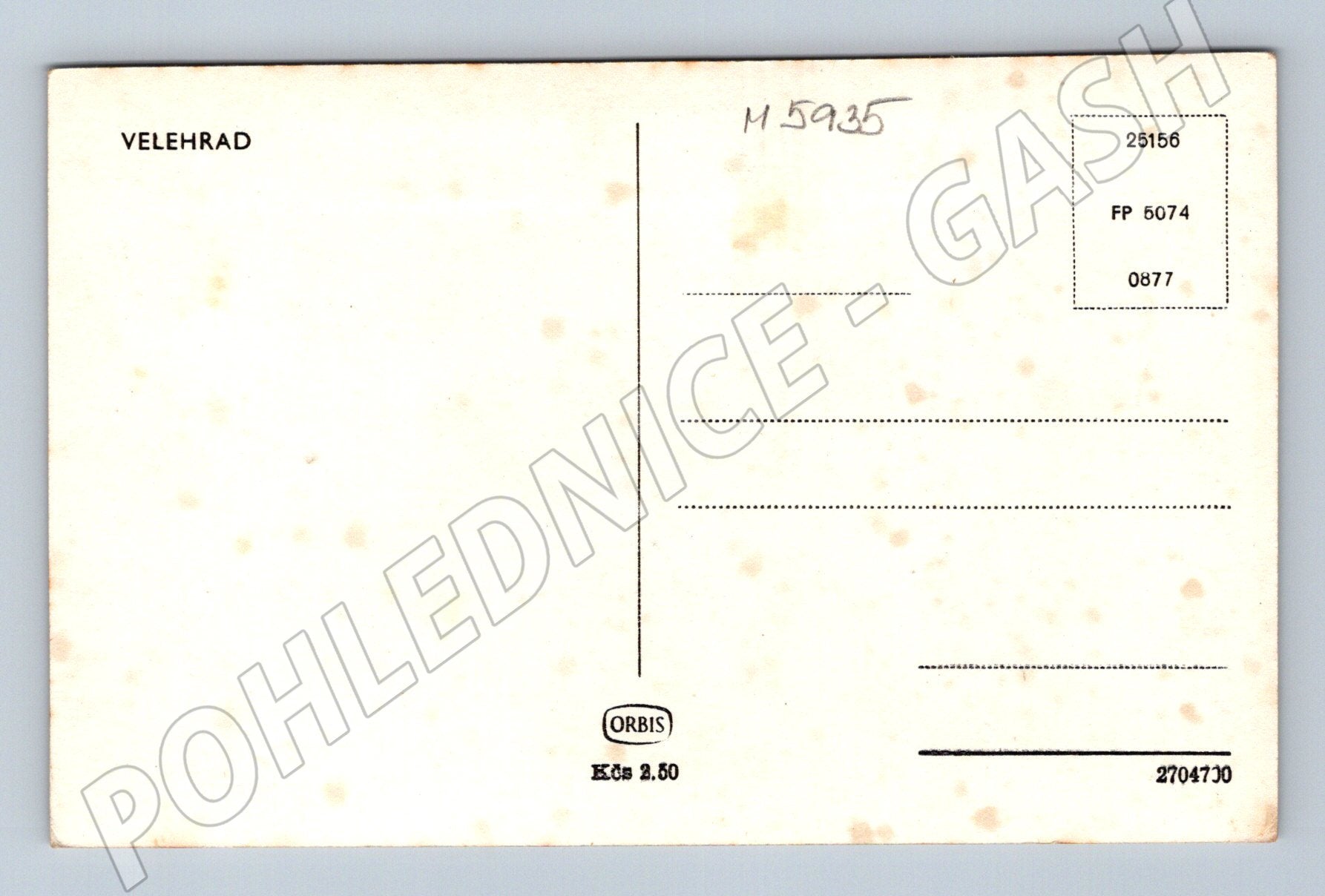 Originální černobílá pohlednice s vyobrazením slavného poutního místa Velehrad, konkrétně areálu velehradské baziliky a okolních budov. Pohlednice je neviložená, s drobnými stopami stáří na zadní straně (lehké flíčky), vydána nakladatelstvím Orbis, č. 25156, FP 5074, 0877. Odhad stáří kolem poloviny 20. století. Výborný sběratelský kousek dokumentující významnou historickou památku na Moravě. Nádherný detail architektury, vhodné do sbírky historických pohlednic českých památek.