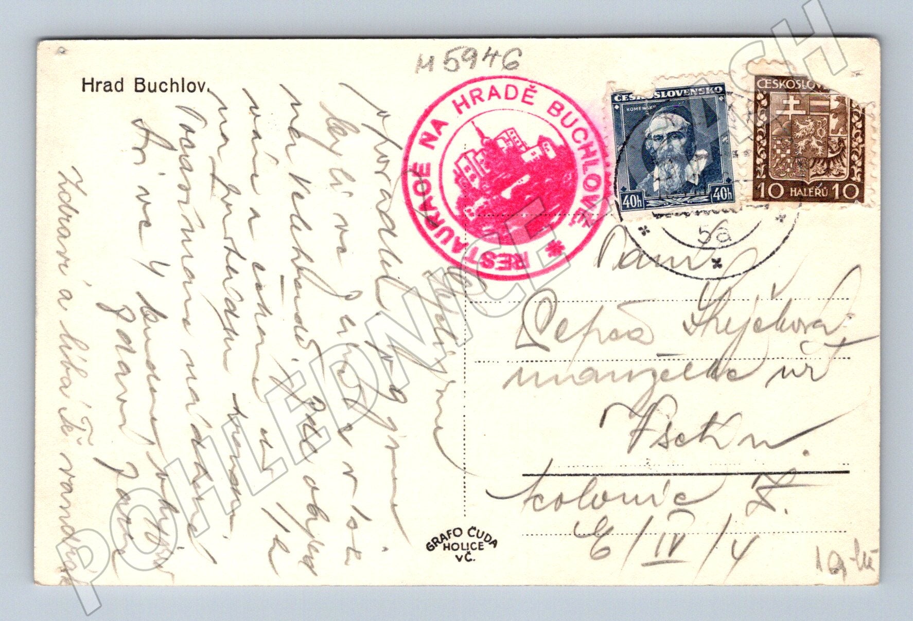Originální stará pohlednice zobrazující hrad Buchlov. Pohlednice je z černobílé fotografie zasazené do přírodního rázu s výhledem na hrad. Na zadní straně je ručně psaný text, poštovní razítko z roku 1946 i výrazné turistické razítko Restaurační na hradě Buchlov . Pohlednice je opatřena dvěma historickými československými známkami (10 haléřů a 40 haléřů). Jedná se o cenný sběratelský kousek vhodný pro milovníky historie, hradů a starých pohlednic. Celkový stav odpovídá stáří, viz foto. Vhodné do sbírky.