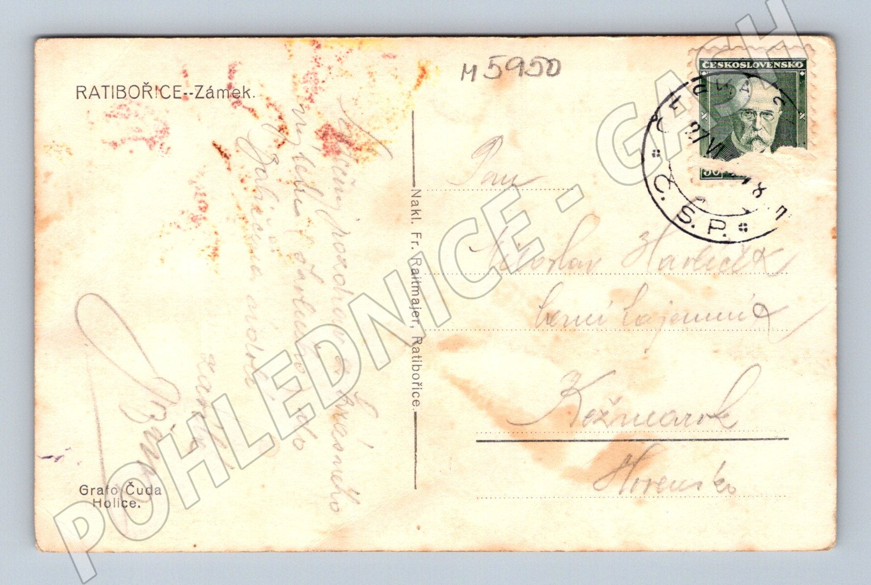 Originální historická pohlednice s motivem zámku Ratibořice. Na pohlednici je uveden nápis RATIBOŘICE - Zámek . Jedná se o černobílou fotografii areálu zámku obklopeného přírodou. Pohlednice prošla poštou (výplatní známka Československo), má ručně psaný vzkaz a adresu, včetně poštovního razítka. Vhodná pro sběratele pohlednic s tématikou českých zámků i milovníky historie Babiččina údolí. Rozměry odpovídají menšímu formátu běžnému do roku 1950. Celkově je ve sběratelském stavu, s patrnými známkami stáří, drobné skvrnky a opotřebení odpovídající věku. Vydavatel: Grafo Čuda, Holice.