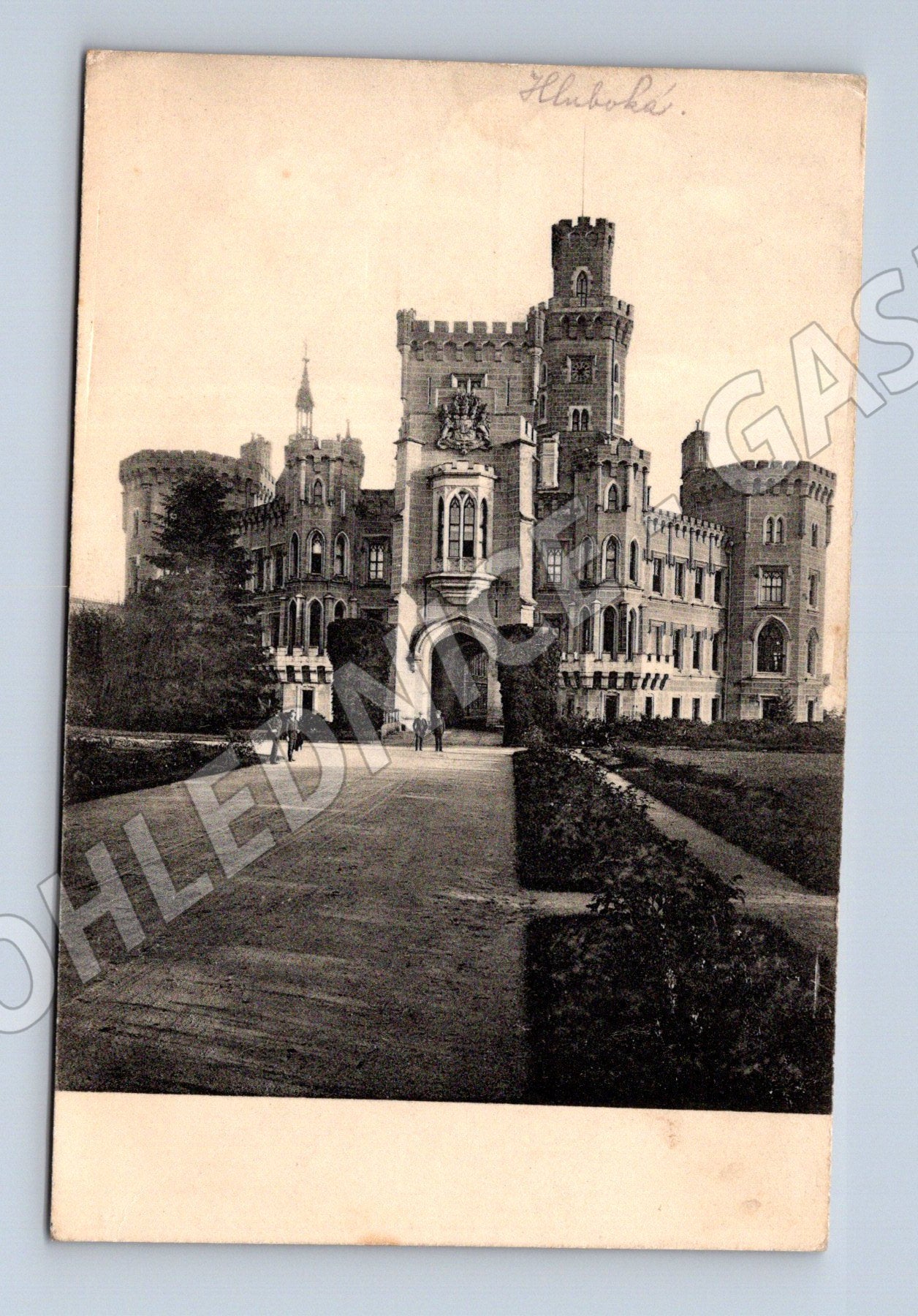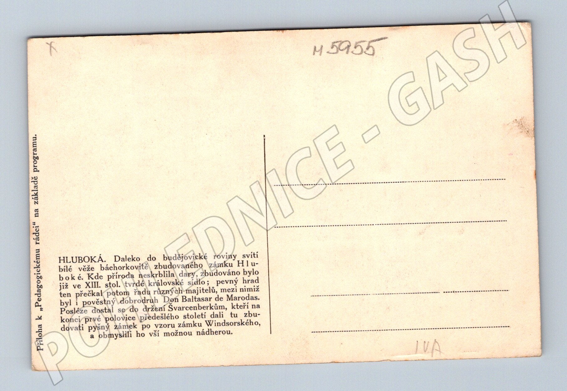Starší černobílá pohlednice zachycující zámek Hluboká. Na lícové straně vidíme majestátní pohled na hlavní průčelí zámku, jehož věže září bíle nad krajinou. Druhá strana je rozdělena na adresní a textovou část, kde se nachází krátký historický popis zámku: Zmiňuje jeho původ jako královského sídla ze 13. století, pevného hradu, jenž měl řadu majitelů – například dobrodruha Dona Baltasara de Marradas. Současná romantická podoba vychází ze vzoru zámku Windsor, což mu dodává unikátní krásu. Pohlednice je vhodná do sbírky historických pohlednic s tématem českých zámků.