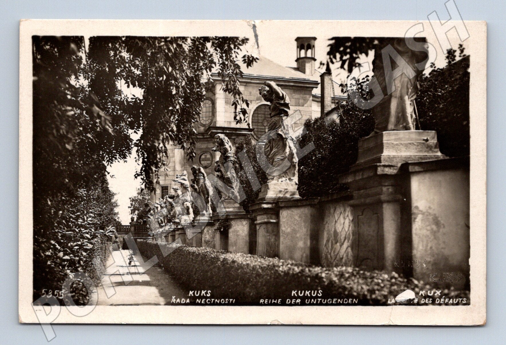 Originální stará pohlednice s motivem barokního areálu Kuks – konkrétně slavné sochařské řady neřestí (Řada nectností), která je dílem Matyáše Bernarda Brauna. Pohlednice zachycuje detailní záběr na sochy s nádvořím a pozadím historické budovy. Popisky ve čtyřech jazycích: česky, německy, francouzsky i latinsky. Zadní strana nepopsaná, ve velmi dobrém sběratelském stavu, pouze mírné opotřebení rožků. Vhodné pro sběratele historických pohlednic a milovníky českých památek.