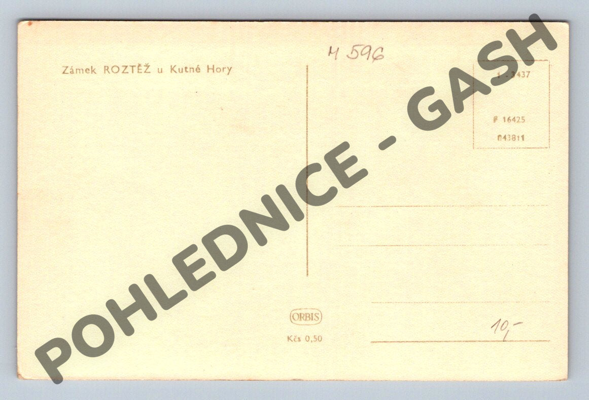 Starší černobílá pohlednice zámku Roztěž u Kutné Hory. Na pohlednici je zachycený pohled na hlavní budovu zámku s okolní zelení a několika zaparkovanými vozy. Pohlednice je v dobrém stavu, na zadní straně je tištěn název místa a značka vydavatele Orbis. Cena uvedená na zadní straně 0,50 Kčs, vhodná pro sběratele historických pohlednic či milovníky architektury českých zámků.
