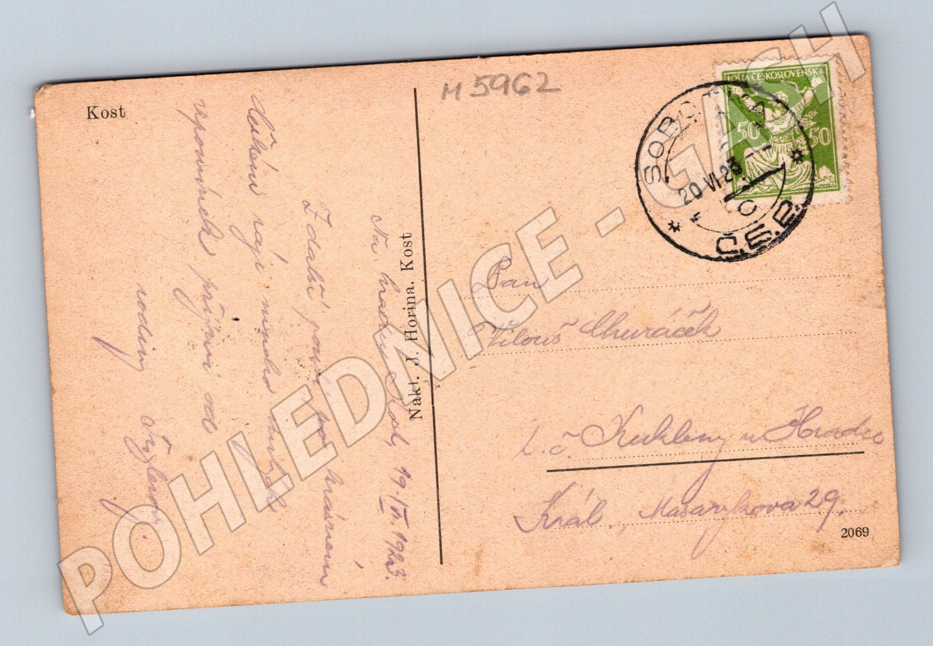Originální historická pohlednice s motivem hradu Kost v Českém ráji. Pohlednice byla vydána nakladatelstvím J. Horina, Kost, a je odeslaná se známkou a razítkem z roku 1942. Na pohlednici je černobílý snímek hradu Kost obklopeného lesy, v popředí je vidět socha a příjezdová cesta. Druhá strana pohlednice je popsána a opatřena poštovní známkou i razítkem. Jedná se o zajímavý sběratelský kousek pro milovníky historických pohlednic a českých hradů. Stav odpovídá stáří, drobné opotřebení na hranách a rozích.