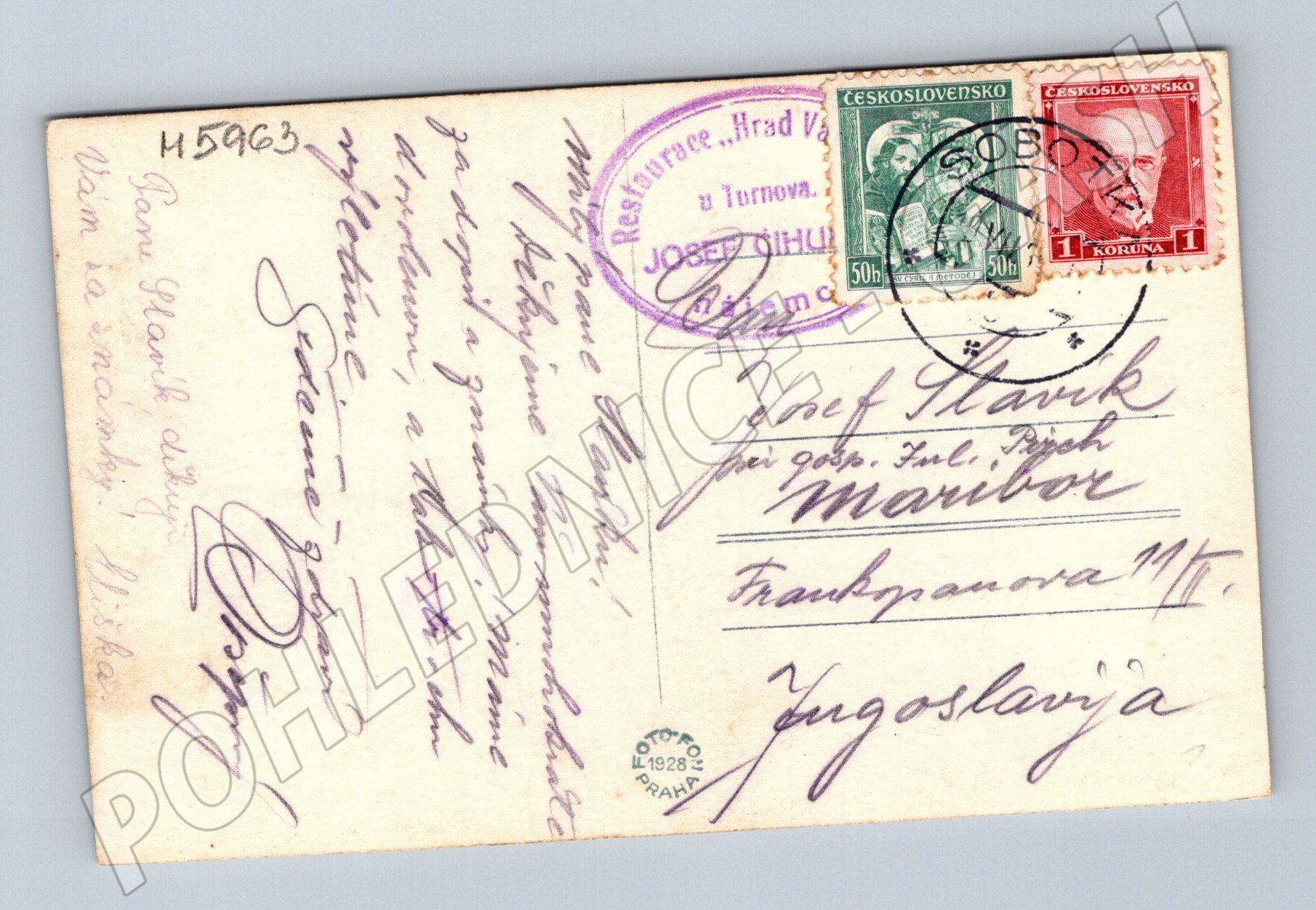 Originální černobílá pohlednice zobrazující hrad Kost v Sobotce. Jedná se o klasickou pohlednici s nádherným pohledem na hradní areál zasazený do okolní přírody. Pohlednice je prošlá poštou, na zadní straně jsou patrné dobové známky Československo i čitelně čitelný rukopis. Vhodné pro sběratele historických pohlednic a milovníky českých hradů a zámků. Stav viz foto, bez vážnějšího poškození. Zajímavý sběratelský kousek s adresací do Jugoslávie.