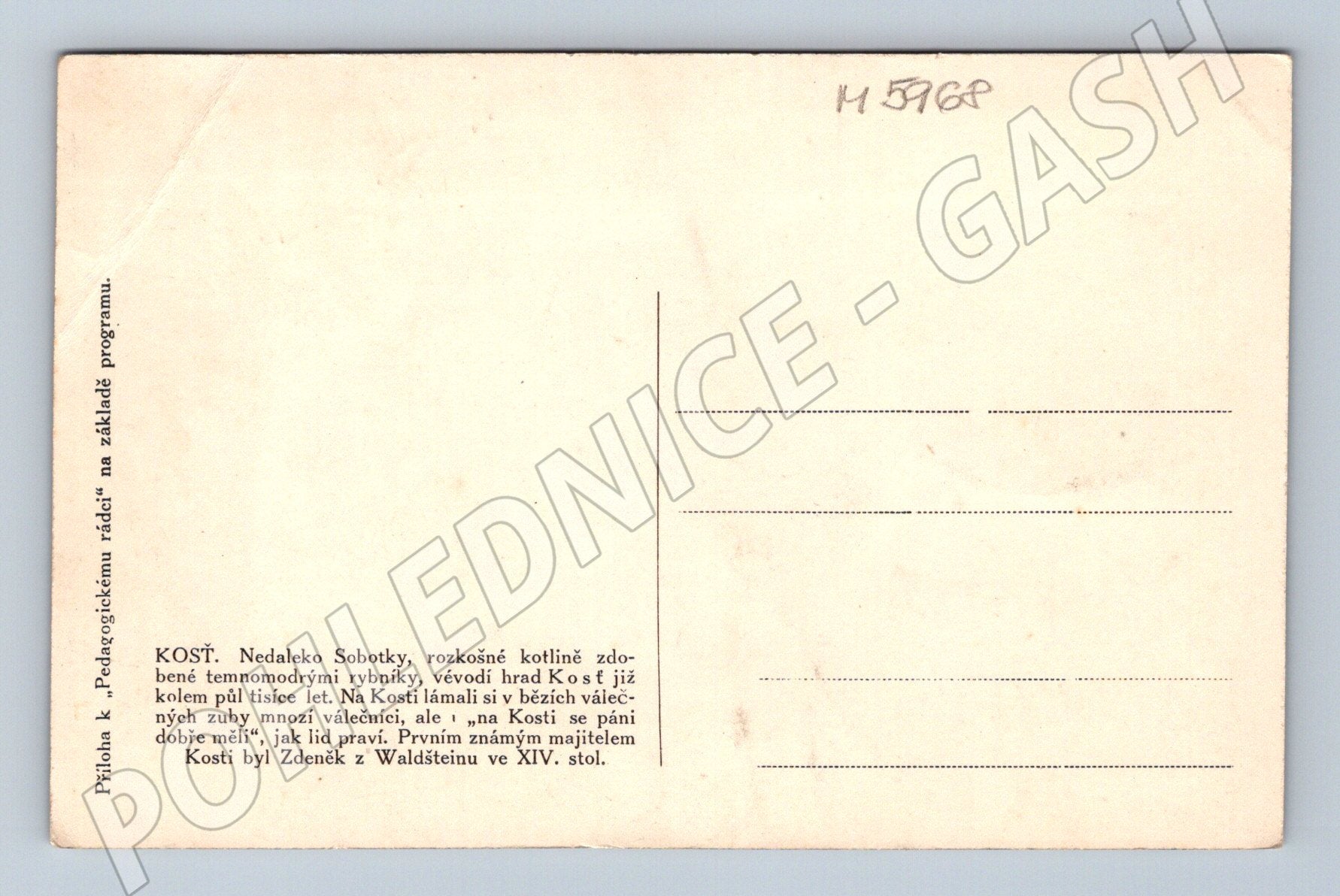 Nabízím starou pohlednici s motivem hradu Kost, který se nachází nedaleko Sobotky. Pohlednice zachycuje romantický pohled na tento významný gotický hrad obklopený přírodou a lesy v Českém ráji. Na zadní straně najdete popis s historickou informací o hradu – jeho stavbě, významu i o prvním majiteli Zdeňkovi z Waldštejna ze 14. století. Pohlednice je v dobrém sběratelském stavu, neprošlá poštou, vhodná pro sběratele historických pamětihodností nebo milovníky českých hradů.