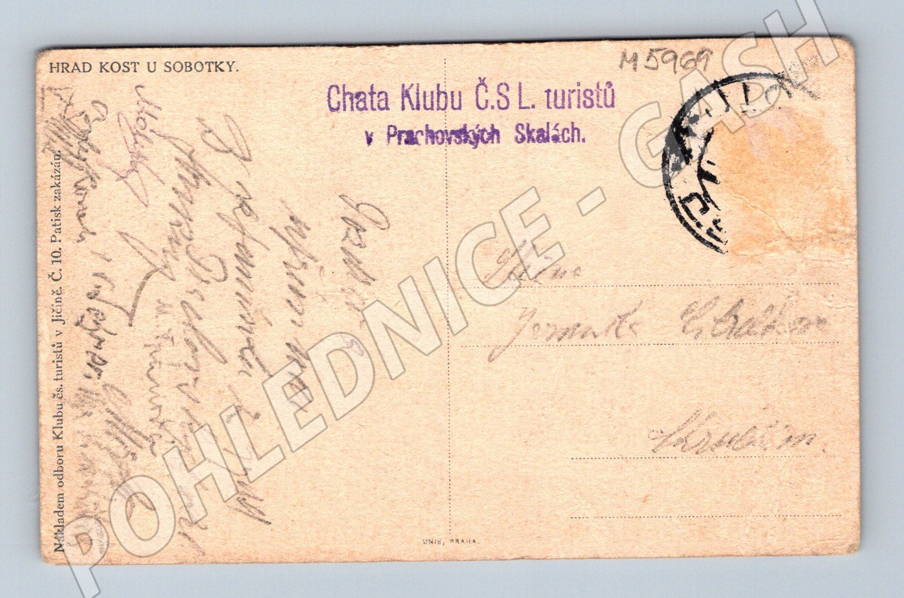 Nabízím starou pohlednici s motivem hradu Kost u Sobotky. Pohlednice pochází z období první poloviny 20. století a její přední stranu zdobí černobílý snímek hradu s jezírkem v popředí, zasazený do krásné přírodní scenérie. Na zadní straně je výrazné poštovní razítko, ručně psaný text a razítko turistické chaty Československého klubu turistů. Pohlednice byla zaslána a nese stopy poštovního provozu (razítko, známka odstraněna, mírné opotřebení). Velmi pěkný sběratelský stav, vhodné pro milovníky historie, pohlednic a památek České republiky. Formát klasický malý, vydáno Klubem českých turistů v Jičíně.