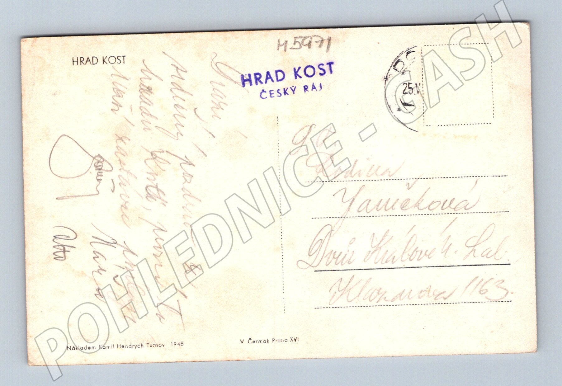 Originální dobová pohlednice s motivem známého hradu Kost v Českém ráji. Pohlednice byla vydána v roce 1948 nakladatelstvím Kamil Hendrych Turnov. Na přední straně je černobílá fotografie hradu obklopeného přírodou, zadní strana je popsaná, s poštovním razítkem a adresou. Skvělý sběratelský kousek pro milovníky historie, architektury a českých památek. Výborný stav odpovídající stáří, viz fotografie. Vhodné do sbírky nebo jako dárek.