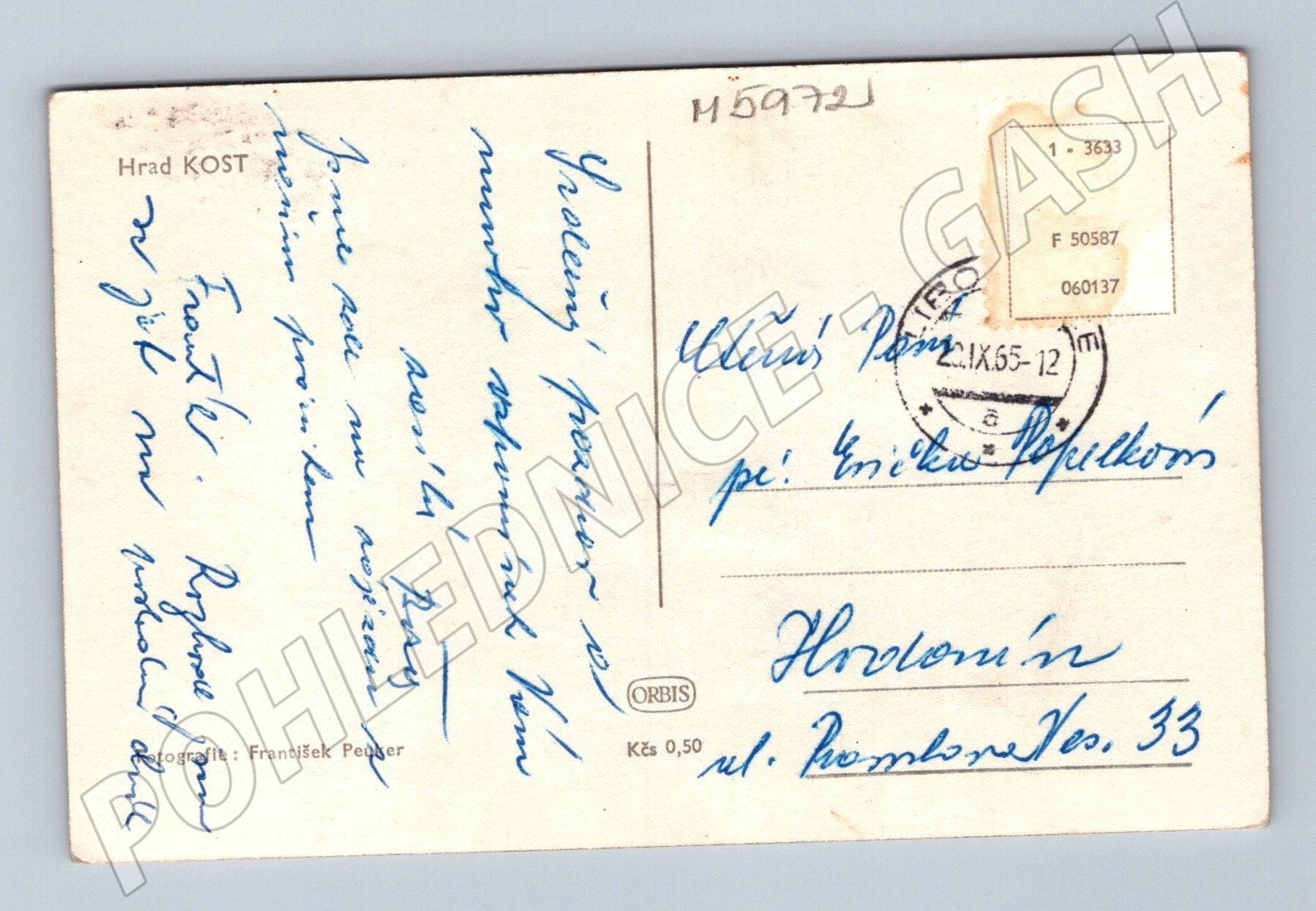 Originální pohlednice s vyobrazením hradu Kost, jednoho z nejznámějších a nejzachovalejších středověkých hradů v České republice. Fotografii pořídil František Pospíšil. Na zadní straně je dobový rukopisný text, známka a poštovní razítko z roku 1955, které potvrzuje její autentičnost a sběratelskou hodnotu. Pohlednice je v dobrém stavu vzhledem ke svému stáří, pouze mírné opotřebení okrajů. Skvělý přírůstek do sbírky historických pohlednic či památek ČR.