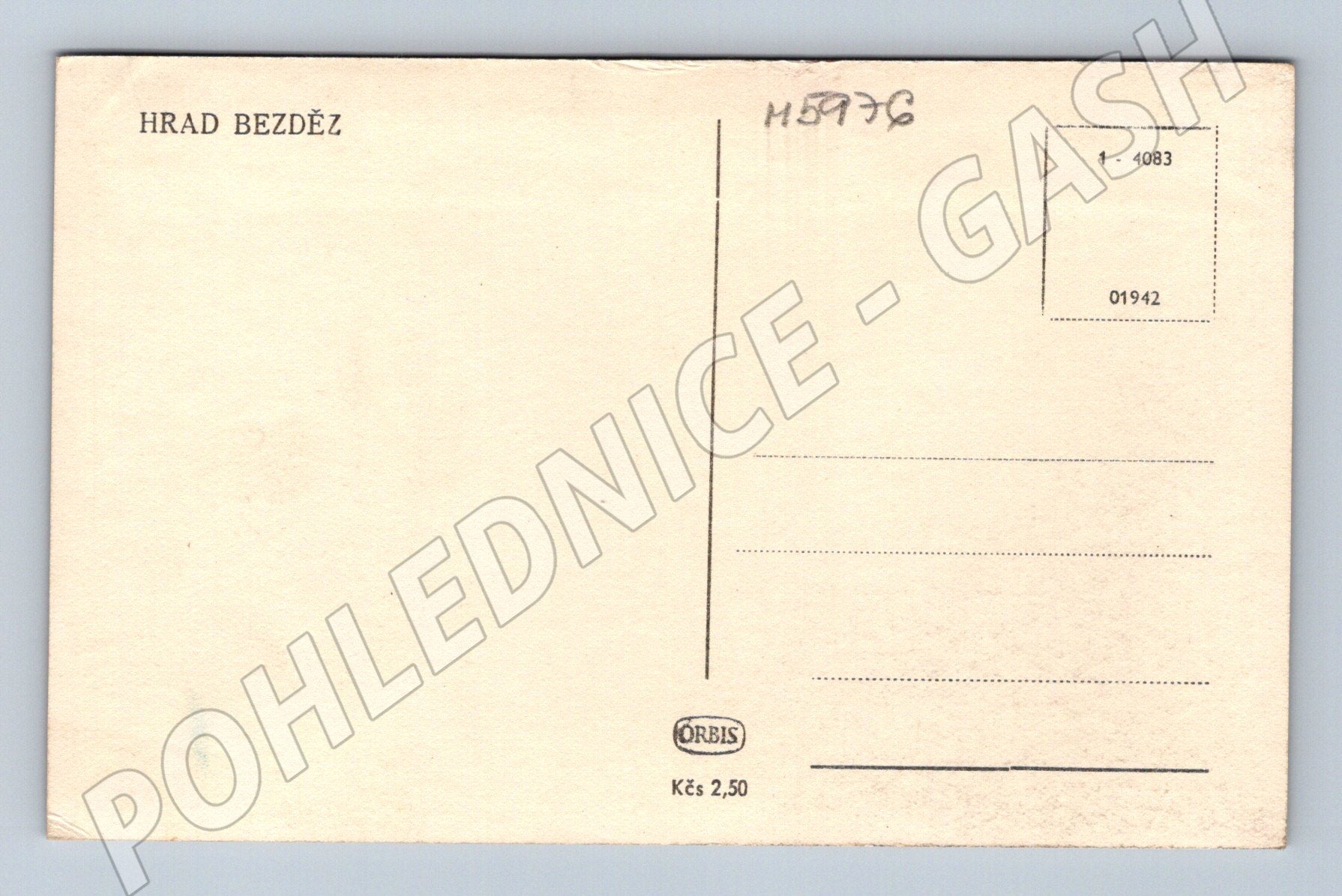 Pohlednice s vyobrazením známého českého hradu Bezděz. Snímek zachycuje panoramatický pohled na hrad umístěný na kopci, obklopený malebnou přírodou a lesy. Pohlednice je v černobílém provedení a pravděpodobně pochází z období Československa, cena 2,50 Kčs. Zadní strana je nepopsaná, s vyznačeným místem pro známku a adresu. Vhodné pro sběratele historických pohlednic, zájemce o české památky či milovníky hradů a zámků.