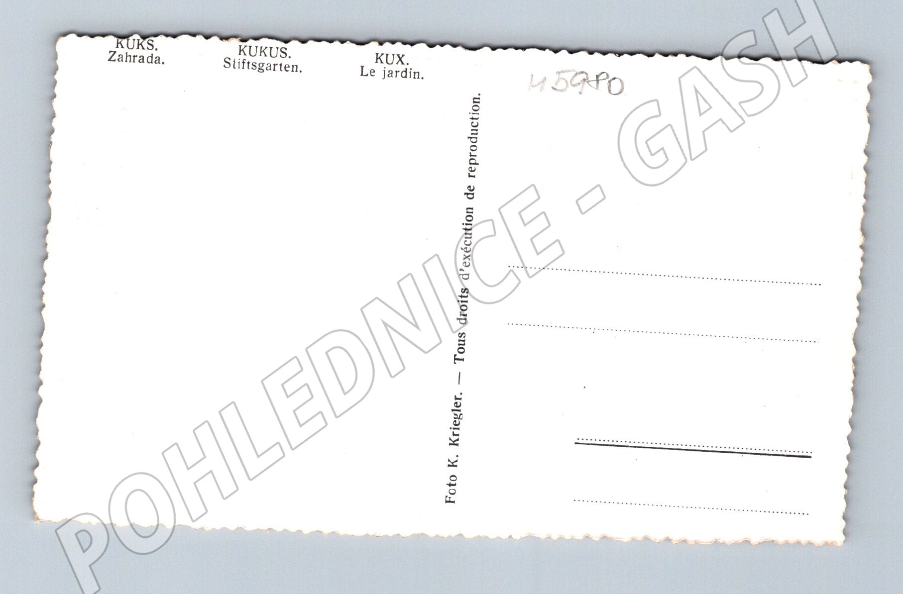 Originální stará pohlednice zobrazující zahradu v areálu barokního hospitalu Kuks. Na pohlednici jsou vidět sochy v zahradě, bohatě členěné záhony a vzrostlé stromy. Na zadní straně je označení KUKS. Zahrada. ve více jazycích, což dokládá turistický význam místa již v době vydání pohlednice. Pohlednice má klasický malý formát a zoubkovaný okraj. Stav pohlednice odpovídá stáří, bez zásadních vad. Vhodné pro sběratele historických pohlednic, zájemce o barokní umění a památky ČR.