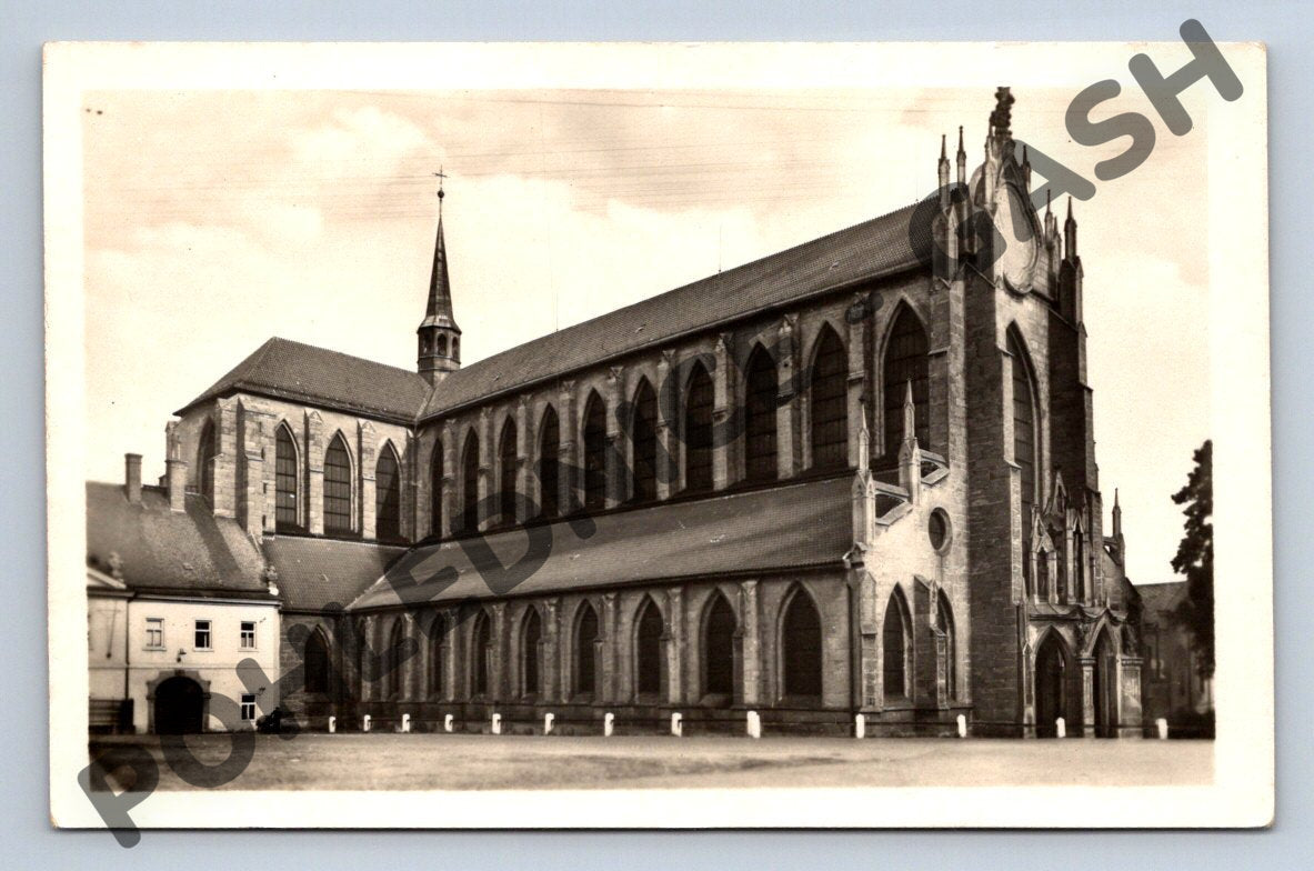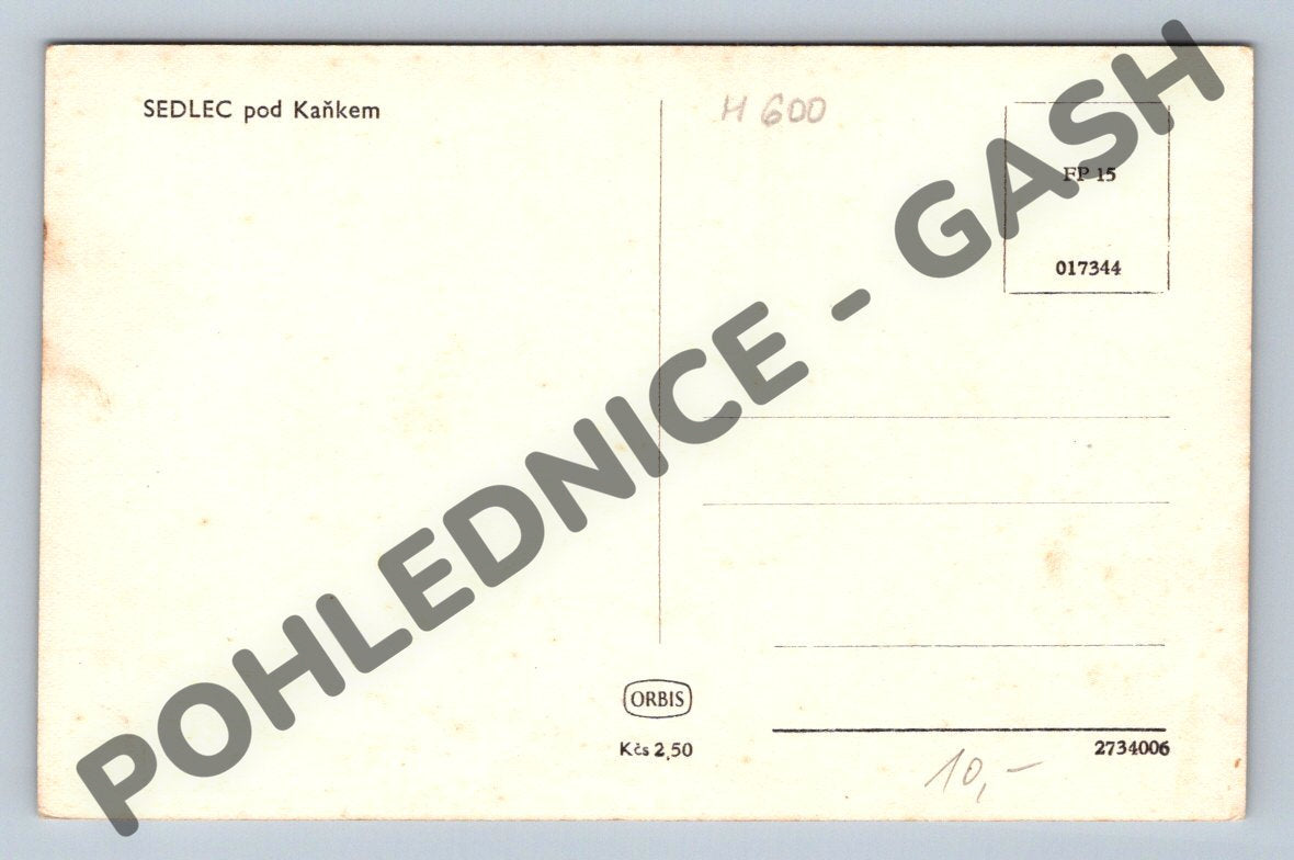 Tato stará pohlednice zobrazuje gotický kostel v Sedlci pod Kaňkem. Pohlednice je černobílá, zachycuje významnou historickou architekturu s ostrými vysokými gotickými okny a štíhlou věží se střechou krytou taškami. Zadní strana pohlednice je nevyplněná, obsahuje pouze tiskové značky a cenu v Kčs 2,50. Pohlednice je ve velmi dobrém stavu, bez výraznějších poškození, vhodná pro sběratele historických pohlednic a milovníky české architektury.