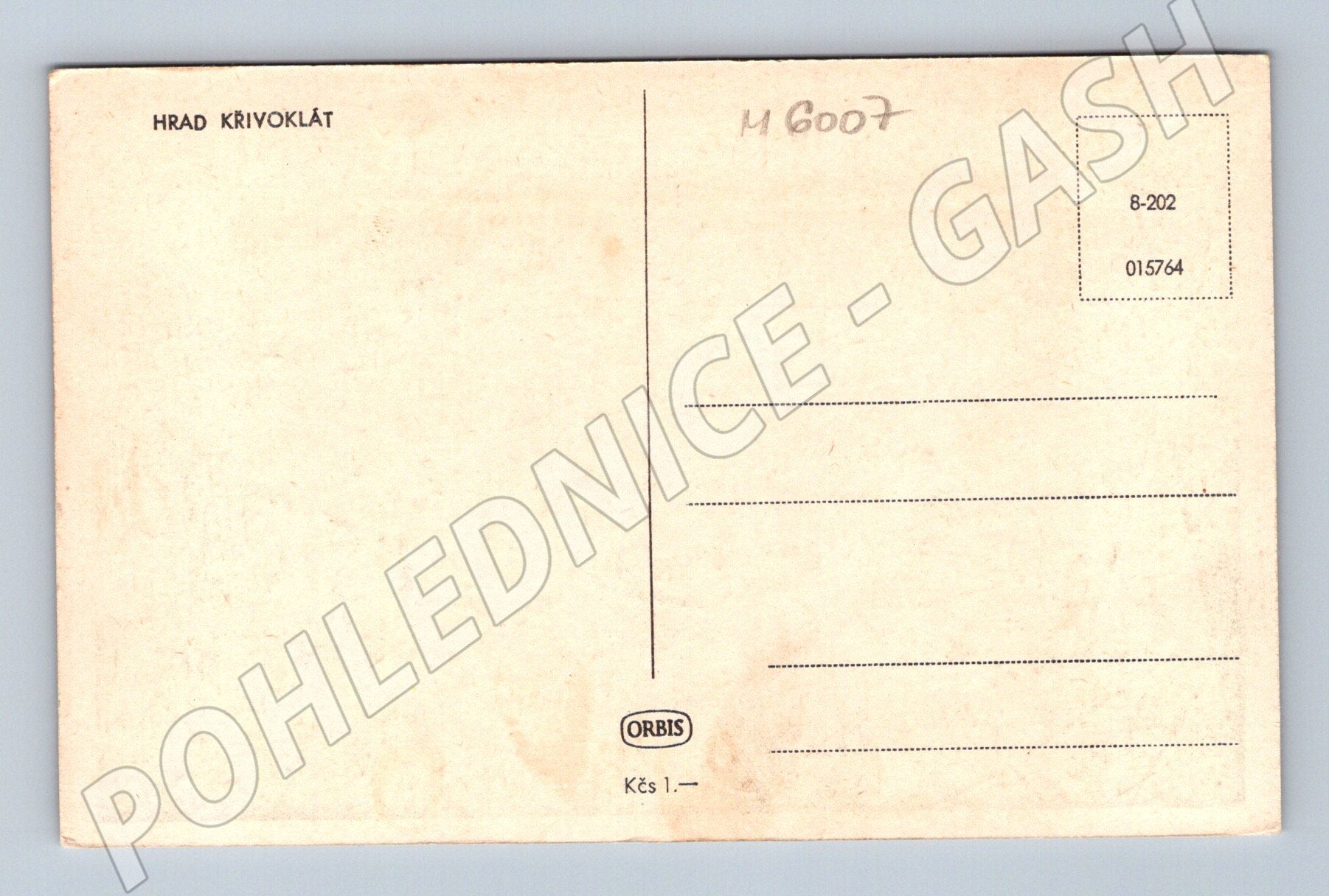 Originální černobílá pohlednice s motivem hradu Křivoklát. Na přední straně je detailní fotografie tohoto významného českého hradu, obklopeného lesy. Zadní strana pohlednice je nepopsaná, s označením HRAD KŘIVOKLÁT a předtištěným místem pro známku, adresu a zprávu. Vydavatel ORBIS, KČs 1,-. Pohlednice je zachovalá a vhodná pro sběratele historických i architektonických památek.