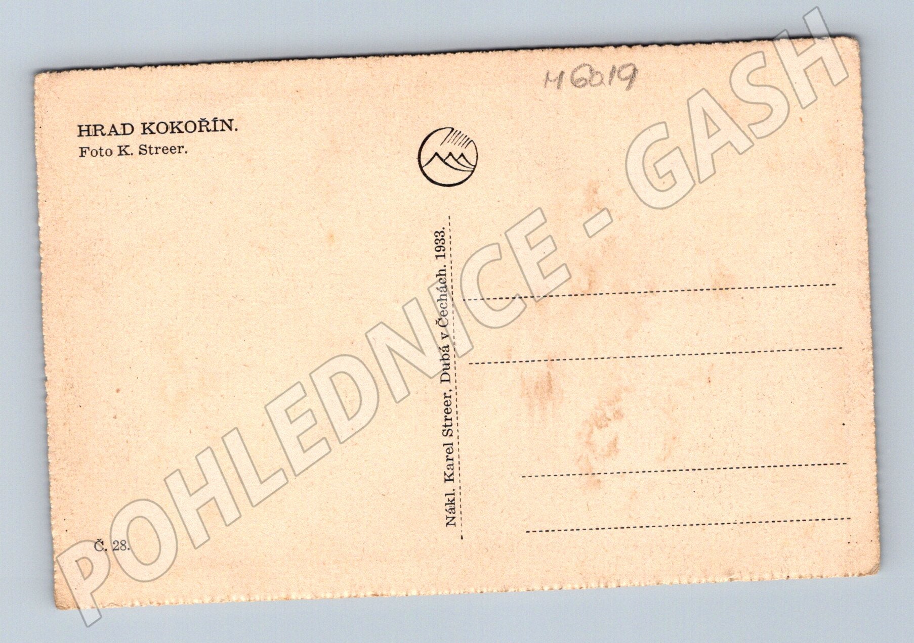 Originální stará pohlednice s vyobrazením hradu Kokořín. Fotografii pořídil K. Streer, vydáno v roce 1933 vydavatelstvím Karel Streer, Dubá v Čechách. Pohlednice je ve velmi dobrém stavu vzhledem ke svému stáří, neprošlá poštou, s jemnými známkami stáří a opotřebení po okrajích. Pohlednice představuje krásný pohled na hrad zasazený v malebné krajině Kokořínska. Skvělý sběratelský kousek pro milovníky historických památek a českých hradů.