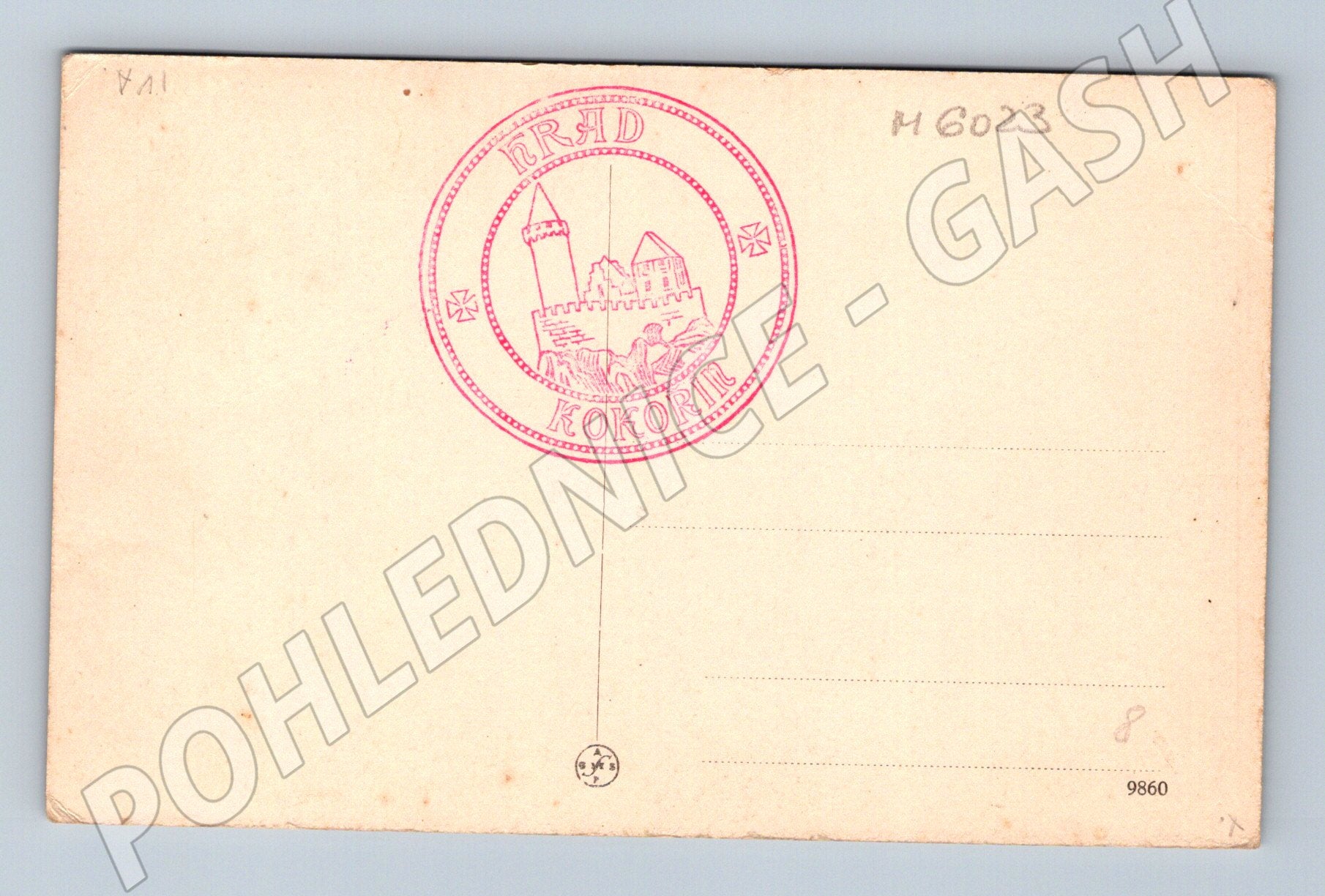Nabízím originální starou pohlednici s motivem hradu Kokořín. Na přední straně je kolorovaná fotografie hradu s dominantní věží zasazená do lesnaté krajiny. Na zadní straně pohlednice je nepotištěná a opatřená velkým červeným kulatým razítkem s nápisem Hrad Kokořín . Pohlednice je ve velmi dobrém stavu, pouze s drobnými stopami stáří odpovídajícími svému věku. Výjimečný kousek pro sběratele historických pohlednic hradů a českých památek.
