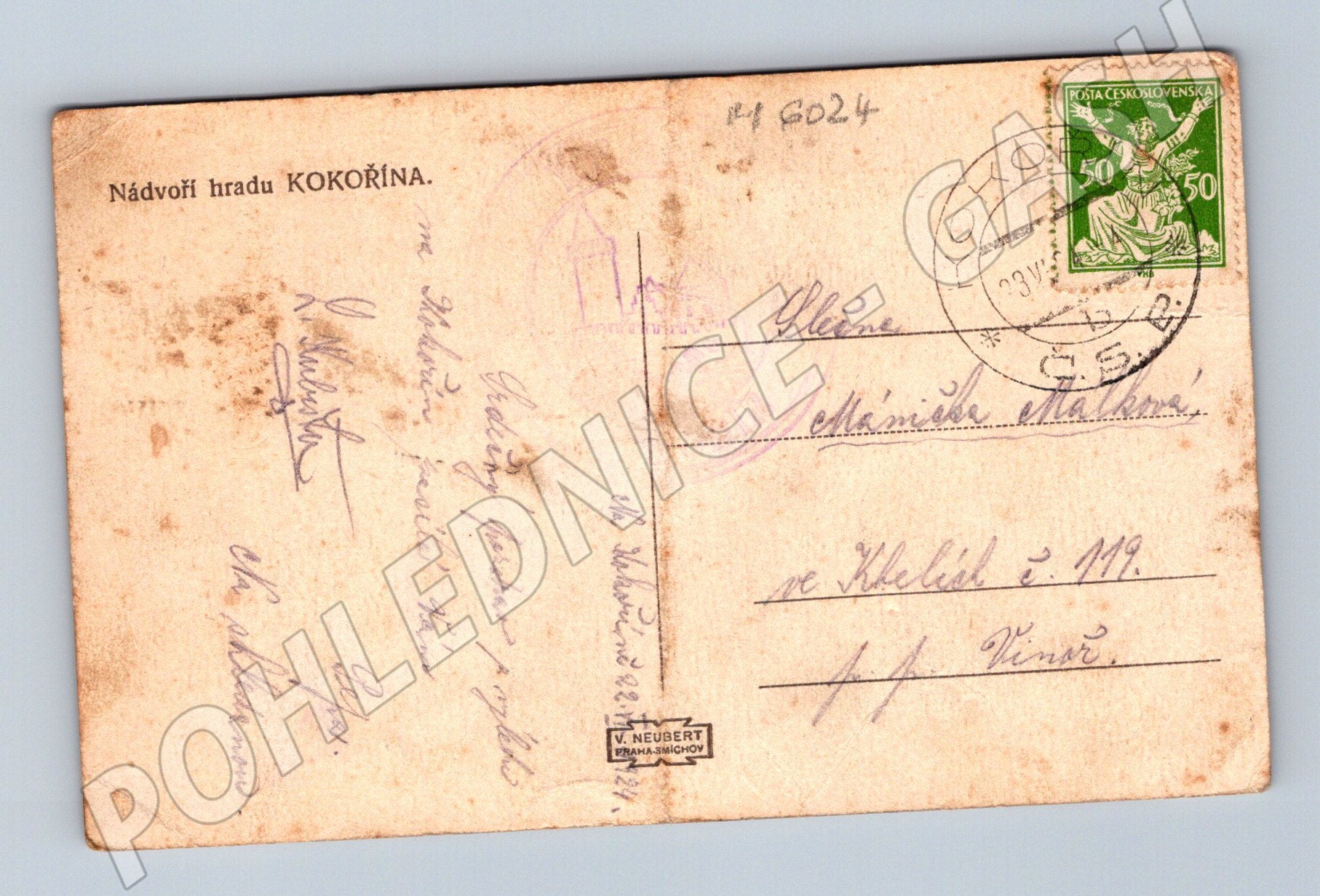 Starší pohlednice s vyobrazením nádvoří hradu Kokořín. Na fotografii je zachycena část hradu s jeho typickou válcovou věží a opevněním. Pohlednice byla odeslána přes poštu, má známku a razítko z Kokořína z roku 1932. Na zadní straně je rukopisná zpráva adresovaná konkrétní osobě. Pohlednice nese drobné známky stáří – mírné zašpinění, otluky na rozích a barevné změny. Jedná se o autentický historický předmět vhodný k rozšíření sbírky pohlednic z oblasti českých hradů.