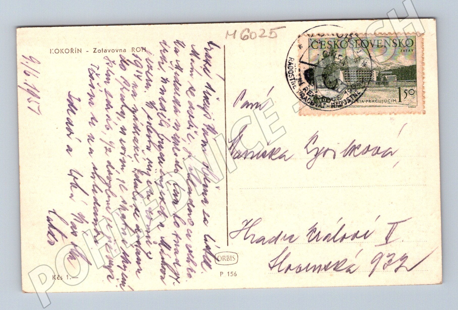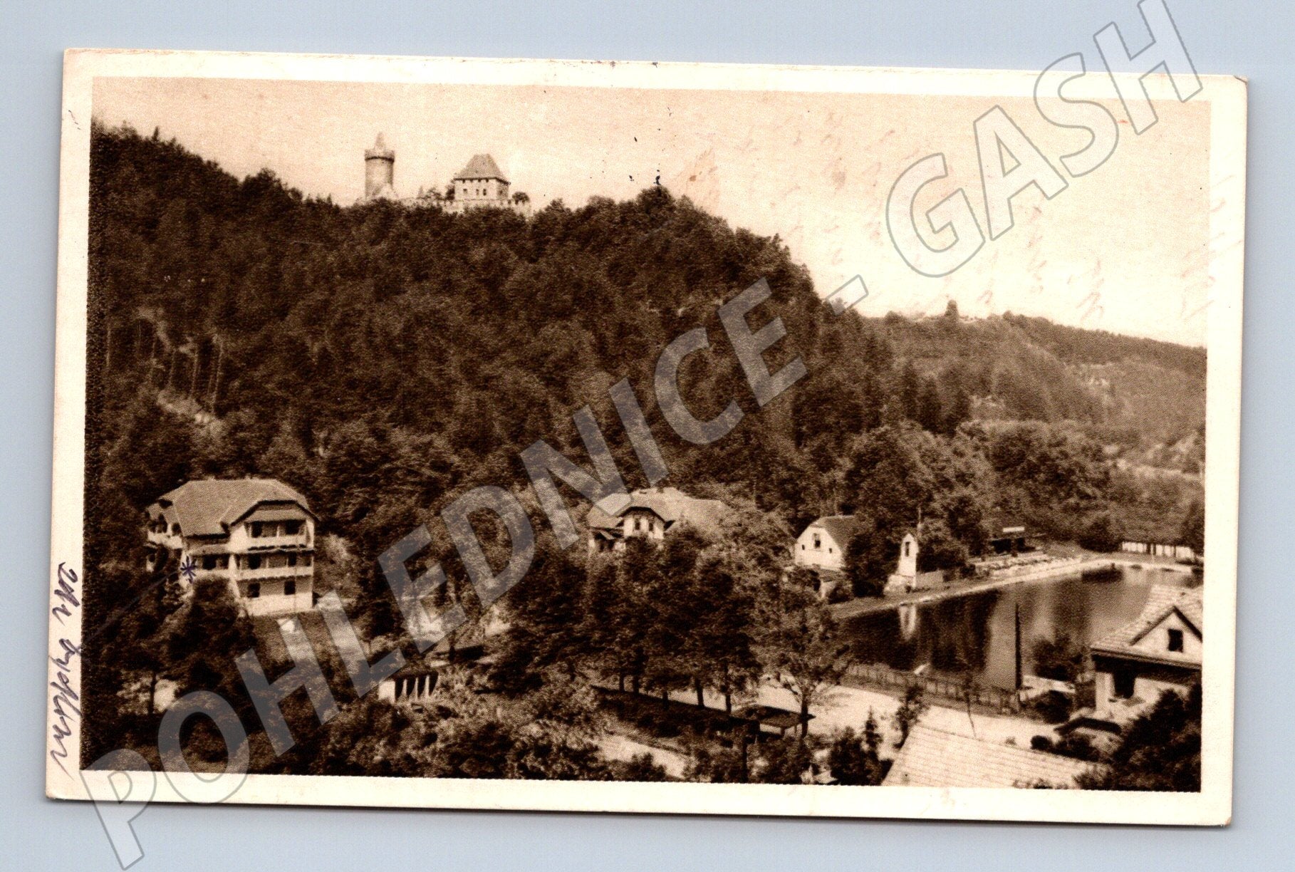 Originální stará pohlednice zobrazující hrad Kokořín a jeho okolí. Na pohlednici je krásný pohled na zalesněný kopec s hradem, na úpatí vidíme lázně a rekreační zázemí. Zadní strana je popsána a orazítkovaná, se známkou a datací z roku 1949. Motiv je autentickým svědectvím doby, vhodné pro sběratele historických pohlednic, milovníky hradů a architektury. Stav viz foto, celkově velmi dobře zachovaná, menší známky stáří na rozích. Unikátní přírůstek do sbírky!