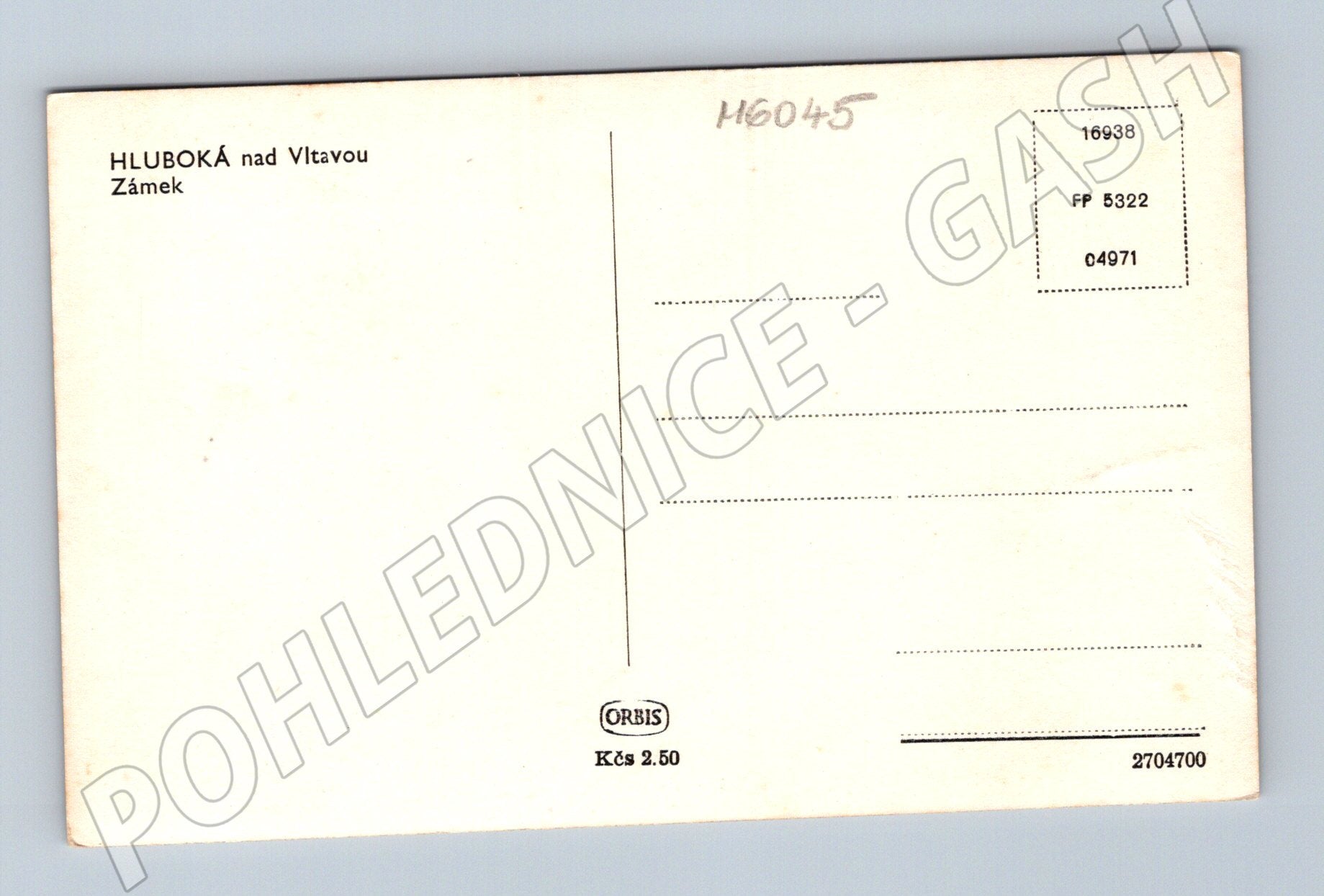 Starší černobílá pohlednice zámku Hluboká nad Vltavou. Na přední straně je zobrazen ikonický novogotický zámek, který patří mezi nejvýznamnější památky České republiky. Pohlednice není prošlá poštou, stav viz foto – mírné známky stáří a používání, rohy lehce opotřebené. Na zadní straně je klasické rozvržení pro adresu a text, vydavatel ORBIS, cena KČs 2,50, číslo 16938. Ideální přírůstek do sbírky pohlednic hradů a zámků nebo památek ČR.