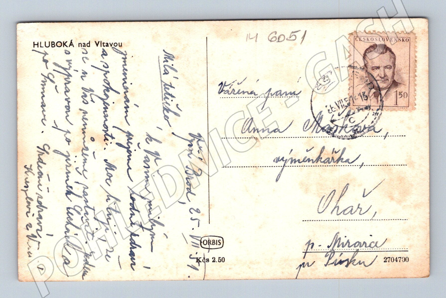 Originální stará pohlednice zobrazující zámek Hluboká nad Vltavou. Pohlednice byla odeslána, jak je patrné podle známky a ručně psaného textu na zadní straně. Na přední straně je černobílá fotografie ikonického zámku ve stylu tudorovské gotiky, obklopeného parkem. Známka i razítko mají patinu stáří. Text je psán čitelnou rukou. Pohlednice je vhodná pro sběratele historických pohlednic, milovníky českých památek i zájemce o korespondenci minulosti. Stav viz foto, rohy mírně opotřebené, přesný rok vydání není uveden, ale jedná se o časové období kolem poloviny 20. století.
