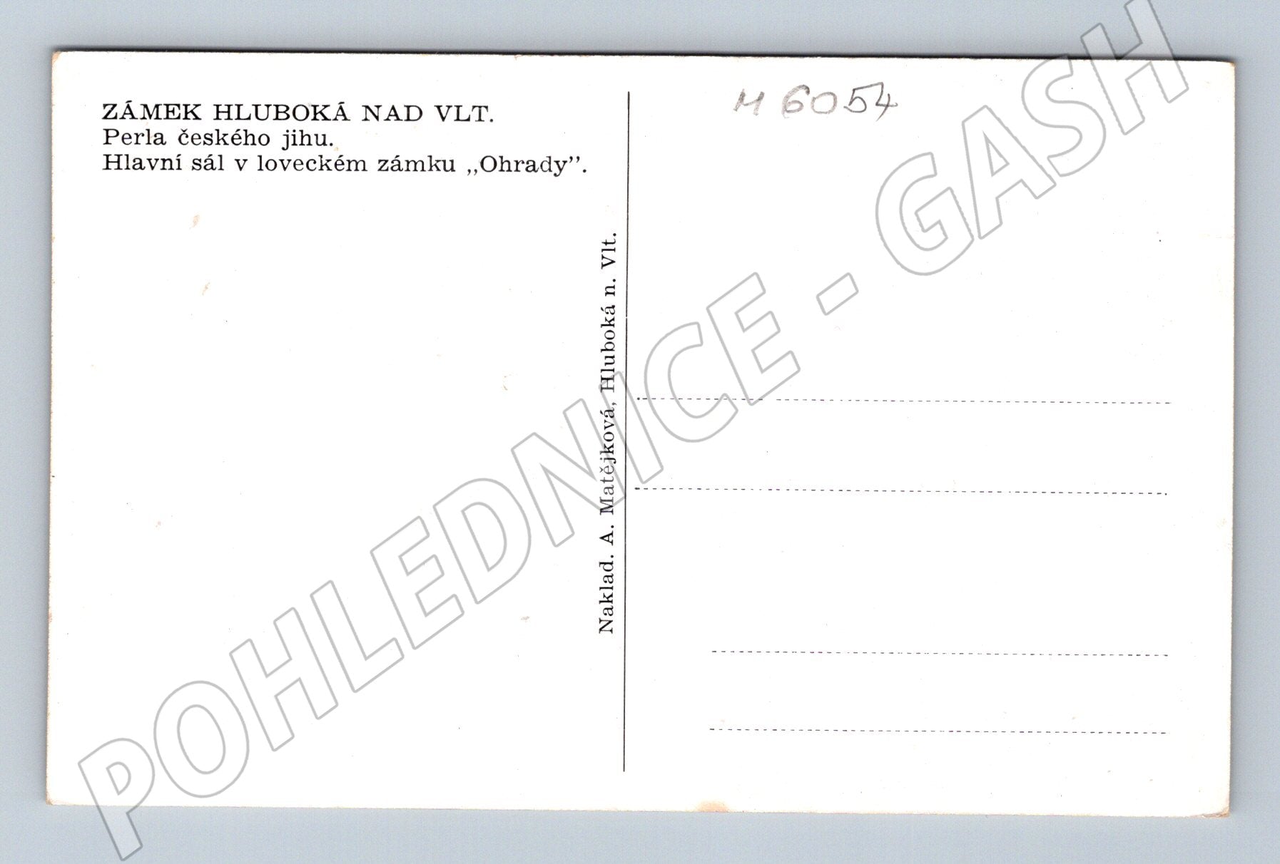Originální historická pohlednice zobrazující hlavní sál v loveckém zámku Ohrady, který je součástí areálu zámku Hluboká nad Vltavou – jedné z nejkrásnějších památek jižních Čech. Na fotografii lze obdivovat bohatou výzdobu stěn loveckými trofejemi, obrazy a historickým nábytkem. Popis na zadní straně pohlednice: ZÁMEK HLUBOKÁ NAD VLT. Perla českého jihu. Hlavní sál v loveckém zámku Ohrady . Pohlednice je vydána nakladatelstvím A. Matějková, Hluboká nad Vltavou. Skvělý sběratelský kousek pro milovníky českých hradů a zámků, vhodná do sbírky i jako dárek.