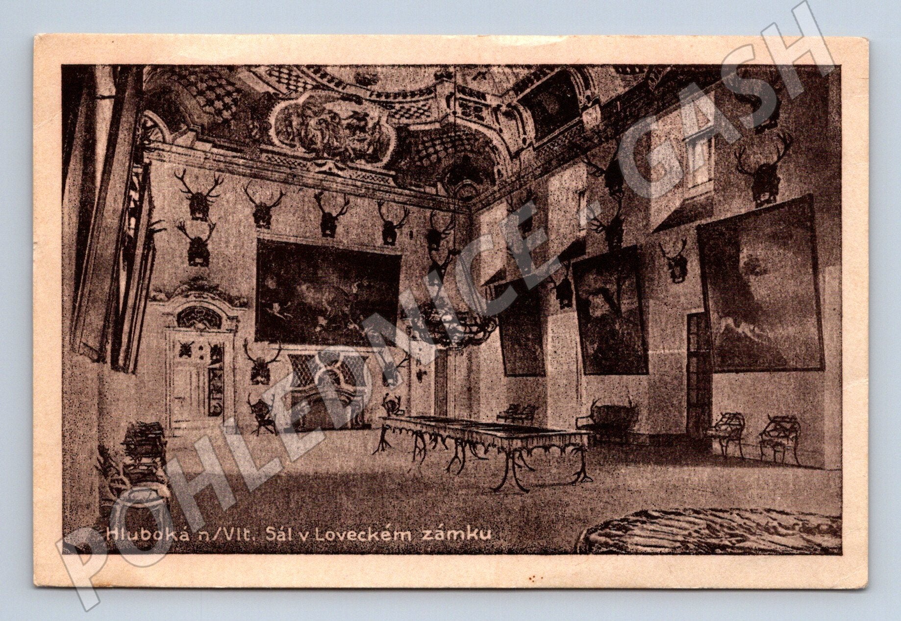 Hluboká nad Vltavou – Sál v loveckém zámku, stará pohlednice