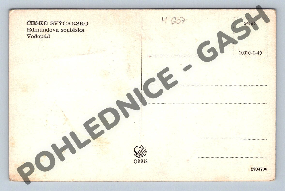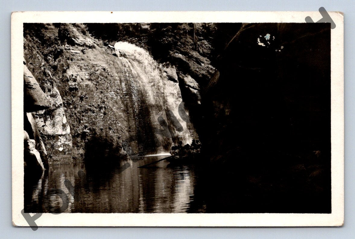 Nabízím originální černobílou pohlednici z oblíbené turistické oblasti České Švýcarsko. Pohlednice zachycuje krásný vodopád v Edmundově soutěsce, jedné z nejmalebnějších přírodních atrakcí tohoto národního parku. Pohlednice je v dobrém stavu s mírnými známkami opotřebení, ideální pro sběratele nebo milovníky přírody a turistiky. Na zadní straně pohlednice je textové označení motivu a prostor pro adresu a známku, bez známek či psaní, což umožňuje zaslání nebo dochování v původním stavu. Vhodná jako suvenýr, sběratelský kousek nebo dekorace.