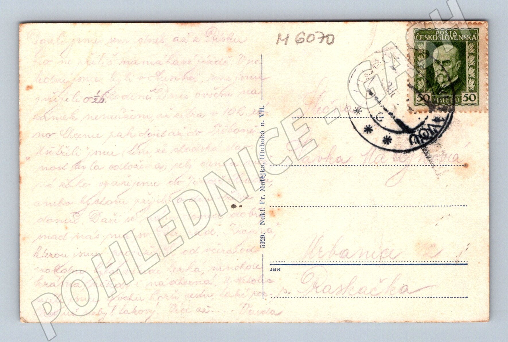 Originální stará pohlednice s vyobrazením zámku Hluboká nad Vltavou, známého také jako perla českého jihu . Pohlednice je tištěna v černobílém provedení a zachycuje romantický pohled na historickou stavbu i přilehlý park. Na zadní straně je ručně psaný vzkaz a poštovní známka s razítkem. Pohlednice nese znaky stáří, je používaná, s drobným opotřebením na rozích, což jí dodává autentickou patinu a kouzlo doby. Vhodné pro sběratele pohlednic, milovníky historie a architektury, nebo jako originální dárek.