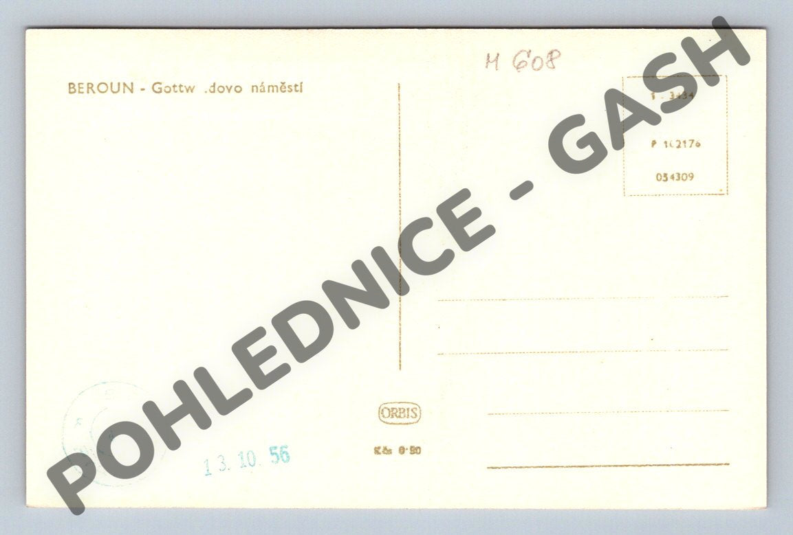 Starý černobílý pohled na Gottwaldovo náměstí v Berouně, zachycující historickou atmosféru města. Pohlednice je opatřena razítkem z roku 1956, vydána nakladatelstvím Orbis. Dobový pohled nabízí náhled na městské budovy, kostel a okolní zástavbu pod kopcem se známou rozhlednou či obeliskem na vrcholu. Ideální sběratelský kousek pro milovníky historie českých měst a pohlednic s autentickým razítkem. Stav pohlednice je velmi dobrý, bez viditelných poškození vyššího rozsahu.