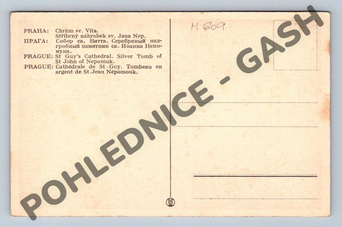 Tato historická černobílá pohlednice zachycuje interiér Chrámu sv. Víta v Praze, konkrétně stříbrný náhrobek sv. Jana Nepomuckého, významného českého světce. Na pohlednici je vyobrazen detailní pohled na náhrobek s figurálními a ozdobnými prvky, včetně andělů a dalších soch. Text na zadní straně pohlednice je uveden ve čtyřech jazycích: česky, rusky, anglicky a francouzsky, což naznačuje mezinárodní původ nebo určení pohlednice. Pohlednice je nevypsaná a může být zajímavým sběratelským kouskem pro milovníky historických památek Prahy a české kultury. Stav pohlednice je viditelně zachovalý s drobnými známkami stáří.