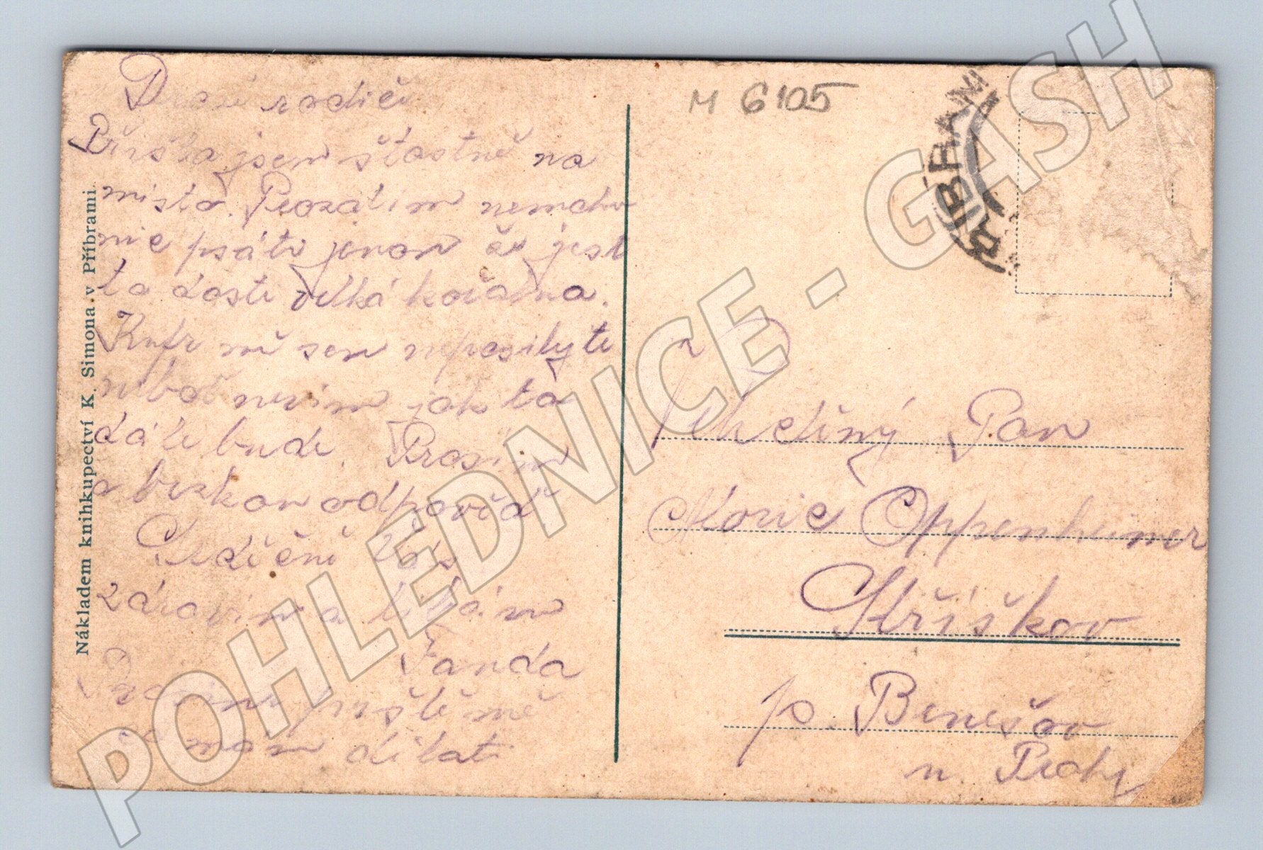 Nabízím starou pohlednici Svaté Hory u Příbrami ve formátu malého rozměru, vydanou před rokem 1950. Pohlednice zobrazuje známé poutní místo Svatá Hora, výraznou architektonickou památku s klášterem a schodištěm vedoucím vzhůru, s krásně barevným podkladem večerní oblohy. Na zadní straně je ručně psaný text a adresa adresáta, poštovní známka byla odstraněna, otisk razítka Příbram je viditelný. Pohlednice je mírně opotřebovaná, místy zašpiněná a v rozích lehce ohnutá, což odpovídá jejímu stáří. Skvělý sběratelský kousek z éry první republiky či dřívější doby.