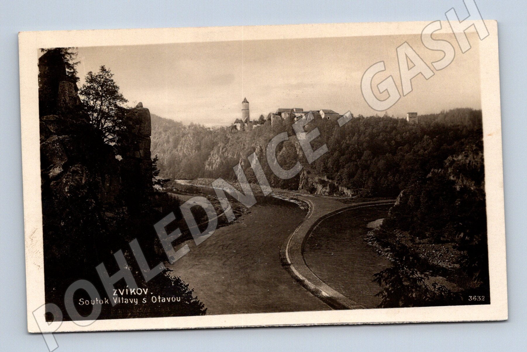 Nabízím originální historickou černobílou pohlednici se zámkem Zvíkov a soutokem řek Vltavy a Otavy. Pohlednice byla vydána v první polovině 20. století, na rubu je razítko Hrad Zvíkov a čs. známka 50 haléřů s portrétem prezidenta T. G. Masaryka. Fotopohlednice je v pěkném stavu, na přední straně je hezky zachycen panorama hradu na skále nad soutokem řek. Vydal Foto Fotr Praha, č. 3632. Vhodné pro sběratele historických pohlednic, milovníky české historie a hradů.