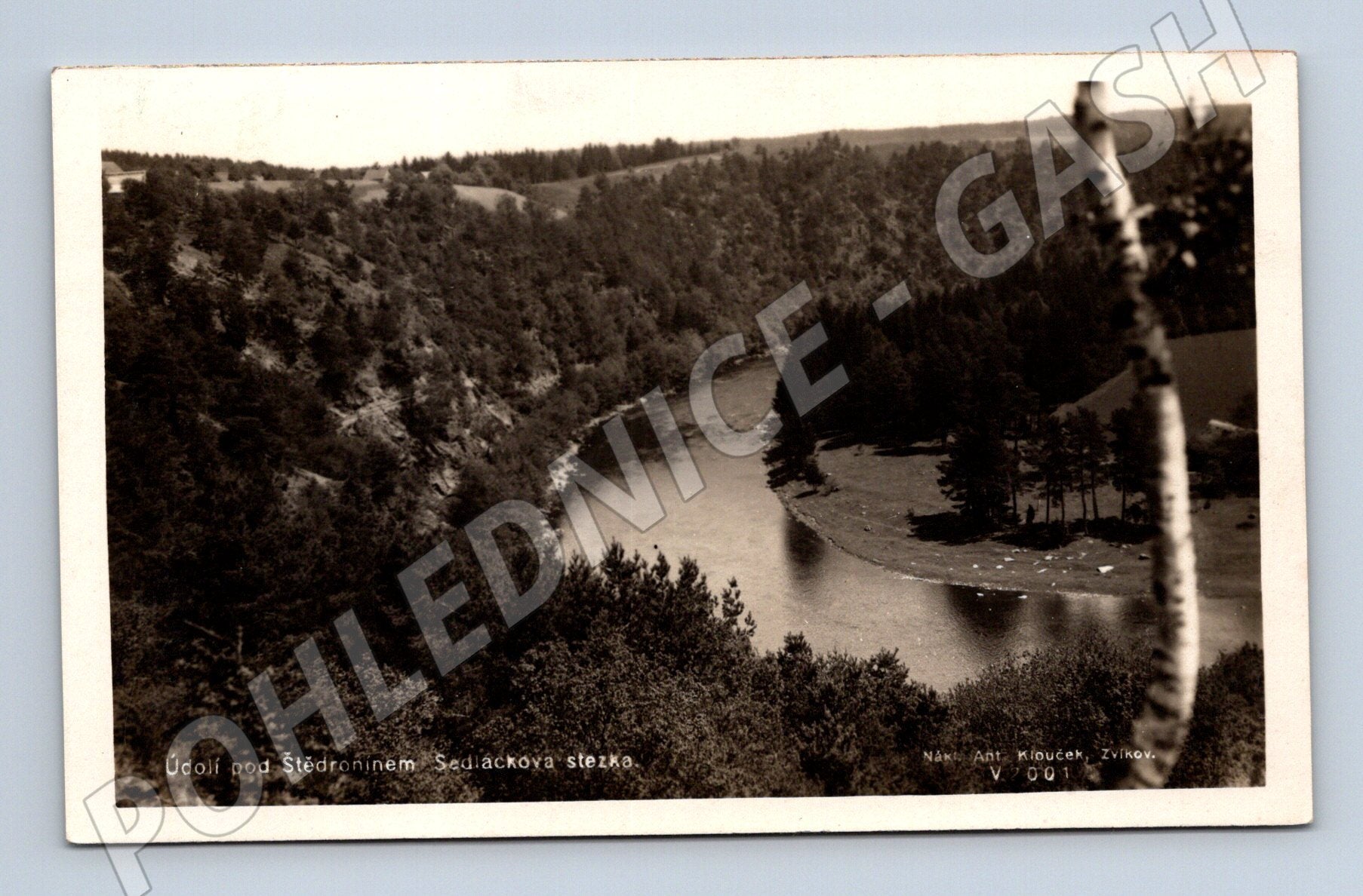 Starší černobílá pohlednice zobrazující údolí pod Stědronínem a Sedláčkovu stezku, vydaná před rokem 1950. Na přední straně je krásný pohled na klikatící se řeku obklopenou lesy, vpravo dole označené popisem. Na zadní straně se nachází razítko hrad Zvíkov a známka s portrétem T. G. Masaryka (50 haléřů) s označením Pošta Československá. Pohlednice je nevyplněná, s drobnými stopami stáří. Vydal Ant. Klouček, Zvíkov. Skvělý sběratelský kousek z období první republiky.