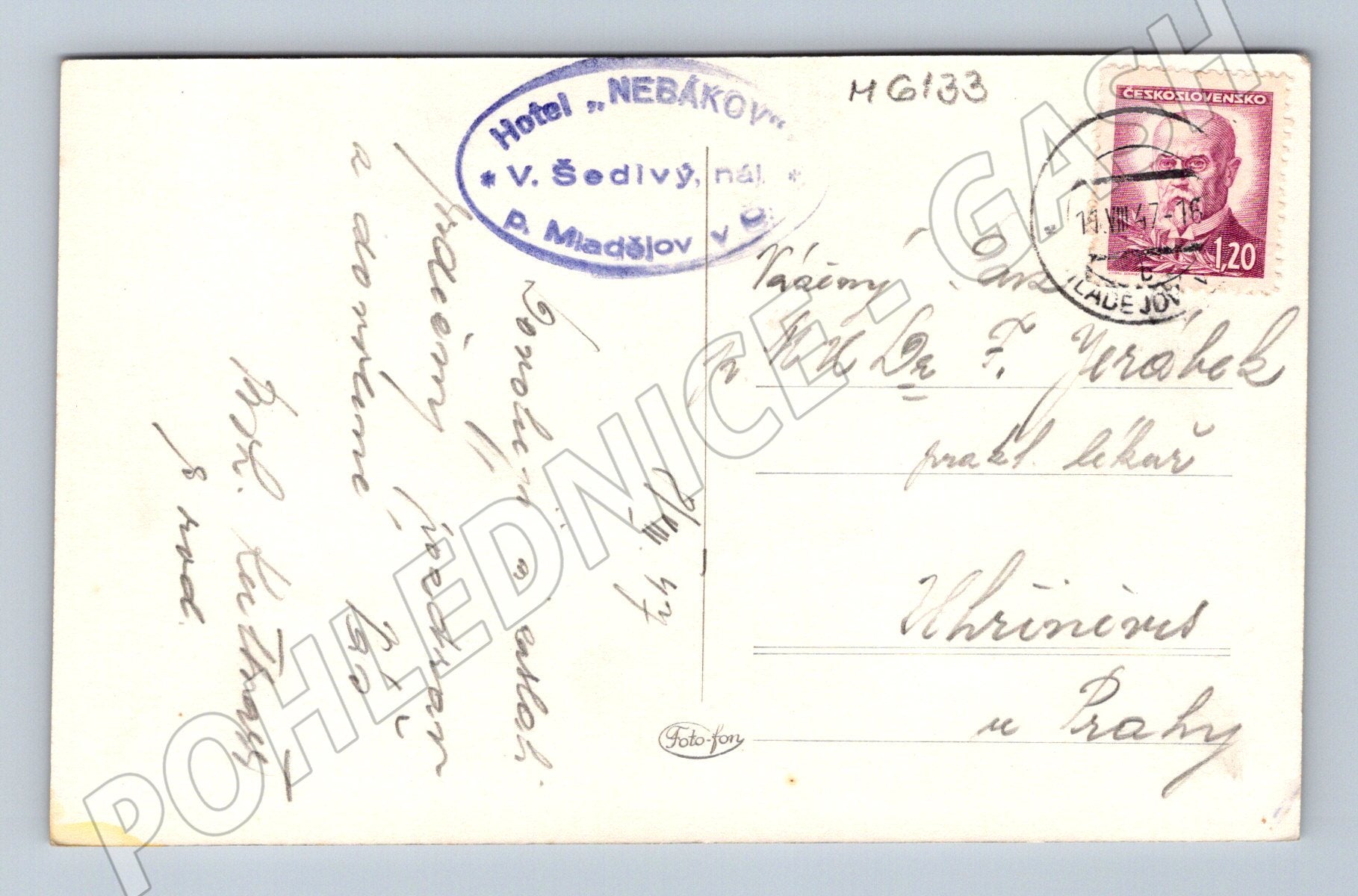 Originální pohlednice s motivem hradu Trosky v Českém ráji. Pohlednice je ve starším černobílém provedení a zobrazuje ikonickou siluetu zříceniny hradu v romantické přírodní scenérii, v popředí s větvemi stromu. Na zadní straně je klasické poštovní rozdělení, původní poštovní známka Československo a ručně psaný vzkaz. Dále je zde otisk razítka hotelu Nebákov . Celkový stav pohlednice odpovídá stáří, známky běžného opotřebení. Atraktivní sběratelský kousek z období první poloviny 20. století, vhodný do sbírky pohlednic s tématikou českých hradů a památek.