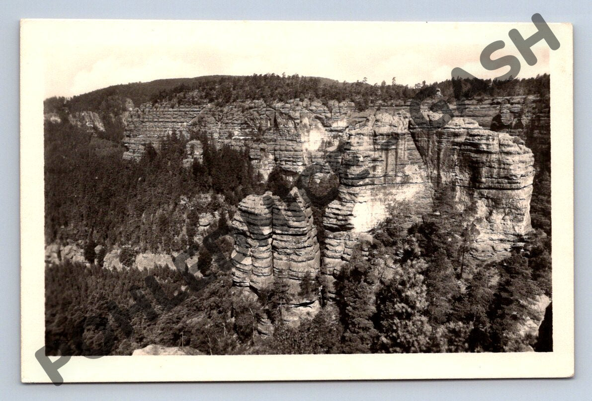 Nabízím starou pohlednici z České republiky zobrazující přírodní krásu oblasti České Švýcarsko, konkrétně skalní útvar nazvaný Stříbrná stěna. Pohlednice je černobílá a představuje působivý pohled na skalní masiv obklopený hustým lesem. Na zadní straně je místo pro psaní a razítko vydavatele Orbis s kódem FP 901. Jedná se o sběratelský kousek, vhodný pro milovníky přírody, geologie a historických pohlednic. Stav je viditelný na fotografiích, bez výraznějších poškození.