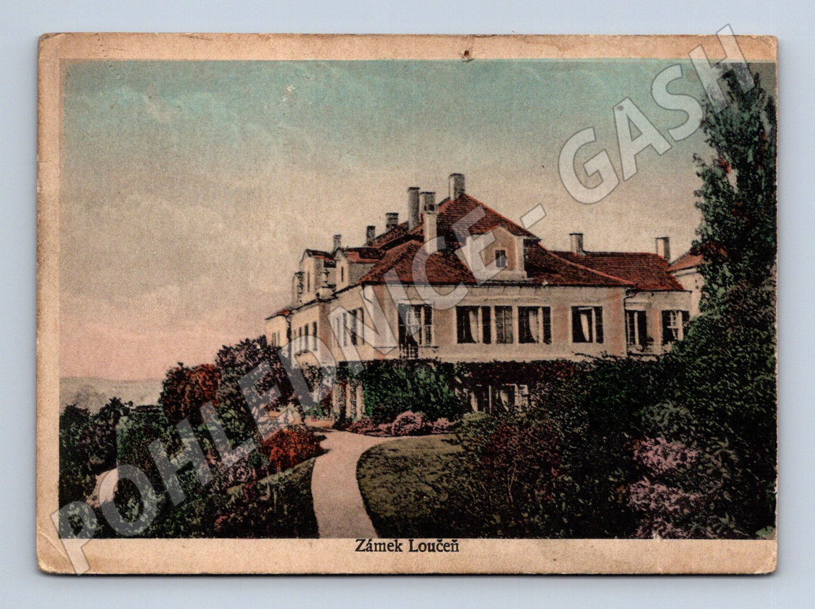 Originální stará pohlednice zobrazující zámek Loučeň. Na přední straně je barevná kresba zámecké budovy obklopené rozkvetlou zahradou. Na zadní straně je ručně psaný text, známka a razítko z období první poloviny 20. století (známka ČSR, poštovně prošlá). Pohlednice je v zachovalém sběratelském stavu, nese stopy stáří a manipulace (patina, drobná opotřebení rohů). Atraktivní předmět pro sběratele historických pohlednic a milovníky českých zámků. Rozměry klasické pohlednice. Autentický doklad historie a poštovního provozu.