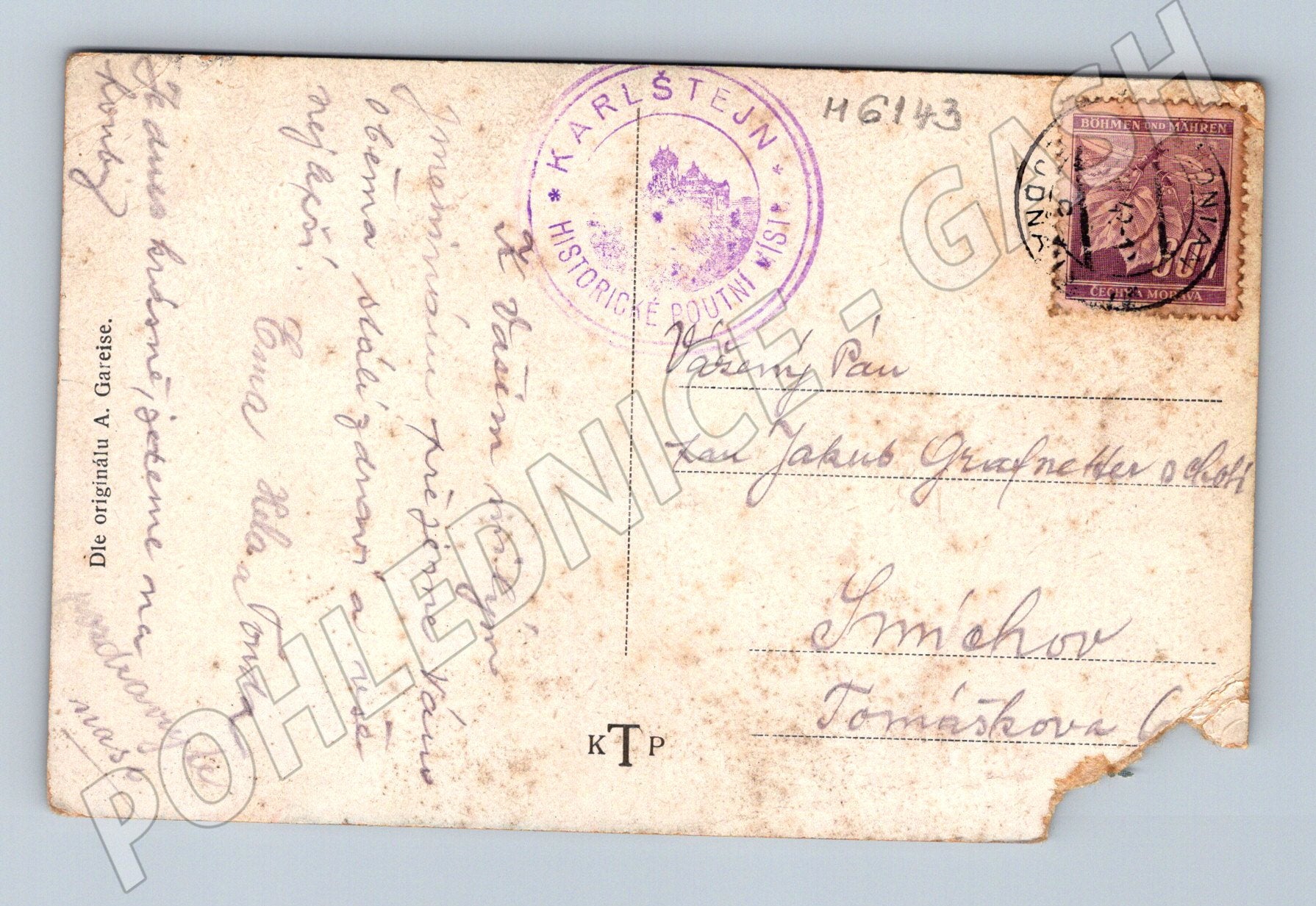 Stará pohlednice Karlštejn – malovaná, známka, razítko
