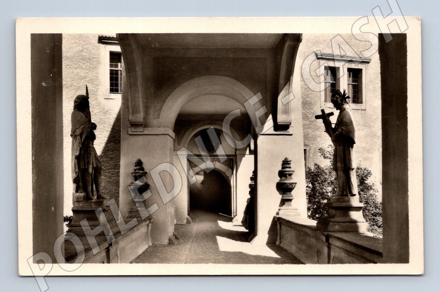 Originální, starší pohlednice zachycující zámecký areál v Českém Krumlově. Na fotografii je krásný arkádový průchod s kamennými sochami svatých, detailní architektonické prvky a historická atmosféra. Na zadní straně je uvedeno Český Krumlov a vydavatel Orbis, cena KČS 2,50. Stav pohlednice viz foto – velmi dobře zachovalá, čistá, nepopsaná. Skvělý sběratelský kousek z období Československa pro milovníky historie, architektury a českých památek.