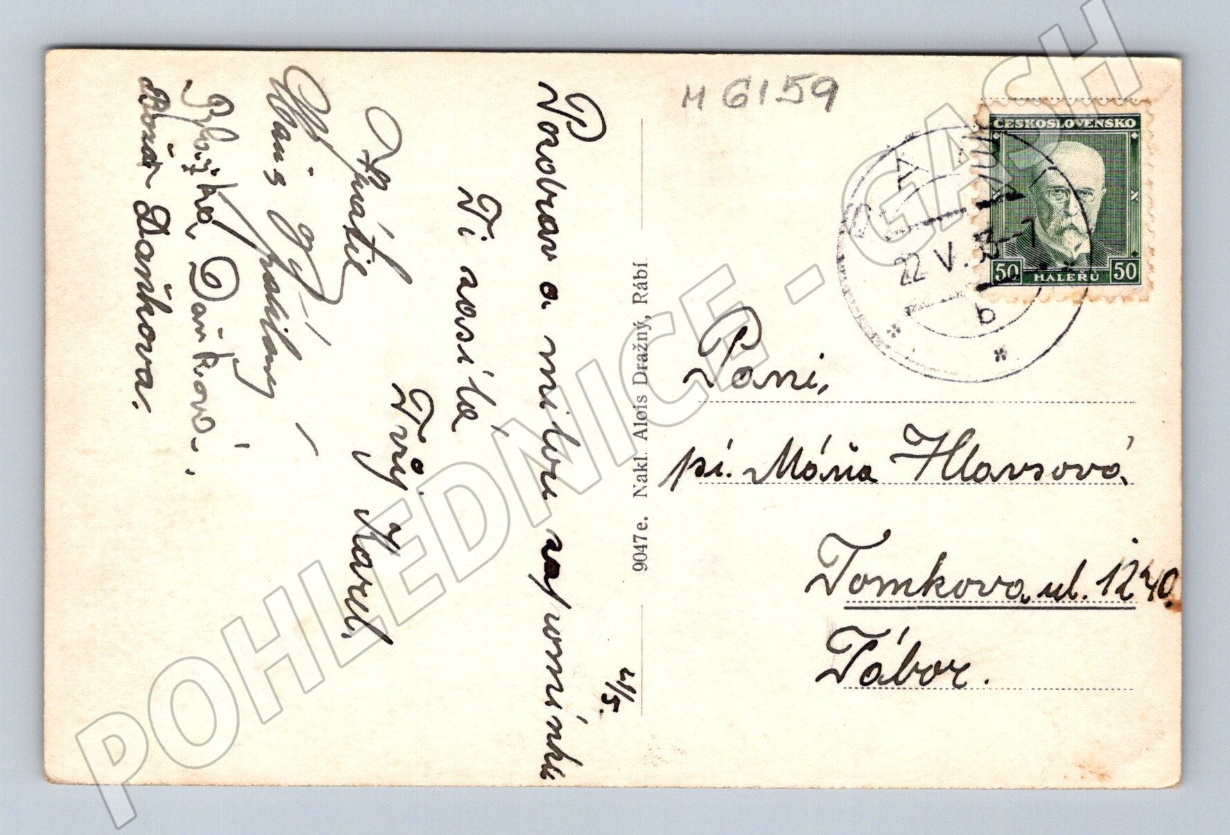 Stará pohlednice hrad Rabí, čb, prošlá poštou, známka ČSR