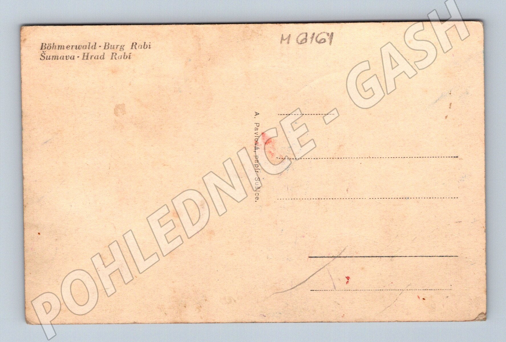 Originální stará pohlednice zobrazující hrad Rabí v oblasti Šumavy (Böhmerwald). Na přední straně pohlednice je krásný černobílý snímek hradu, pod hradem se rozprostírá malebné městečko. Na zadní straně je označení Böhmerwald - Burg Rabi / Šumava - Hrad Rabí i místo pro adresu a známku. Pohlednice je ve sběratelském stavu, s drobnými známkami stáří (flíčky, otěry, mírně ohnuté rohy), což jí dodává autentický historický charakter. Skvělý přírůstek do sbírky pohlednic s motivem českých hradů!