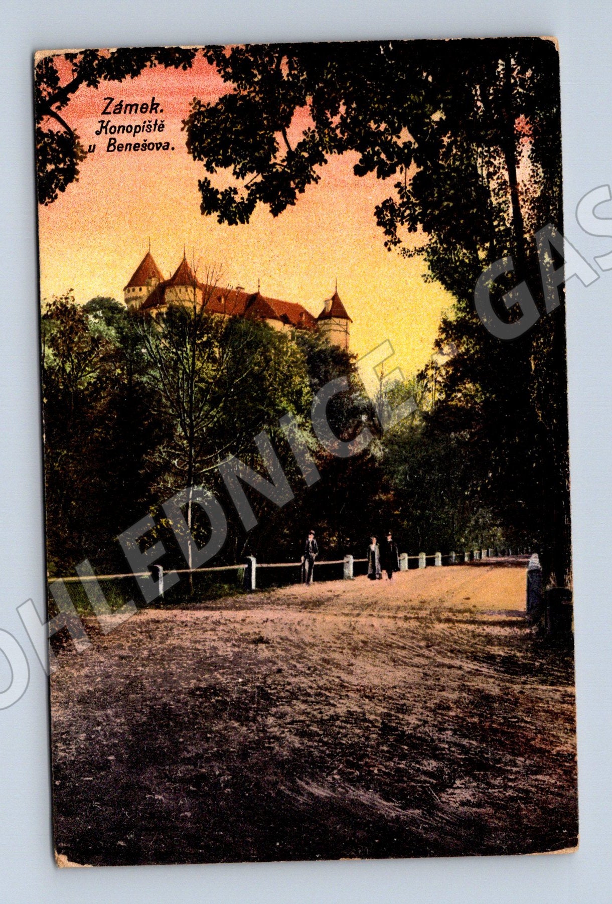 Nabízím originální starou pohlednici s motivem zámku Konopiště u Benešova. Pohlednice je kolorovaná, zachycuje zámek mezi stromy v podvečerní atmosféře. Na přední straně vlevo dole je nápis Zámek Konopiště u Benešova . Rubová strana je čistá, bez popisu či známky, pouze s vyznačením pro adresu a text. Pohlednice nese známky stáří – drobné opotřebení, rohy lehce ohnuté. Vydavatel E.R.P., číslo 14396. Vhodné pro sběratele historických pohlednic i milovníky památek a architektury. Skvělý sběratelský kousek s jedinečnou atmosférou počátku 20. století.