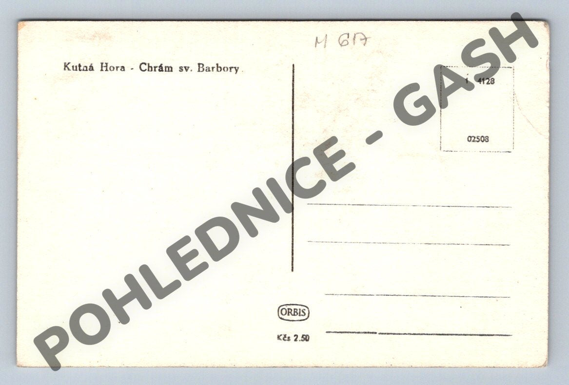Nabízím k prodeji starou pohlednici zobrazenou v černobílém provedení s krásným pohledem na Chrám svaté Barbory v Kutné Hoře. Pohlednice je vydána nakladatelstvím Orbis a zachycuje jeden z nejvýznamnějších gotických památek v České republice. Pohlednice je v zachovalém stavu, bez výraznějších poškození, ideální pro sběratele historických a architektonických pohlednic. Cena na zadní straně 2,50 Kčs naznačuje starší období vydání. Výjimečný exemplář pro milovníky historie a české architektury.
