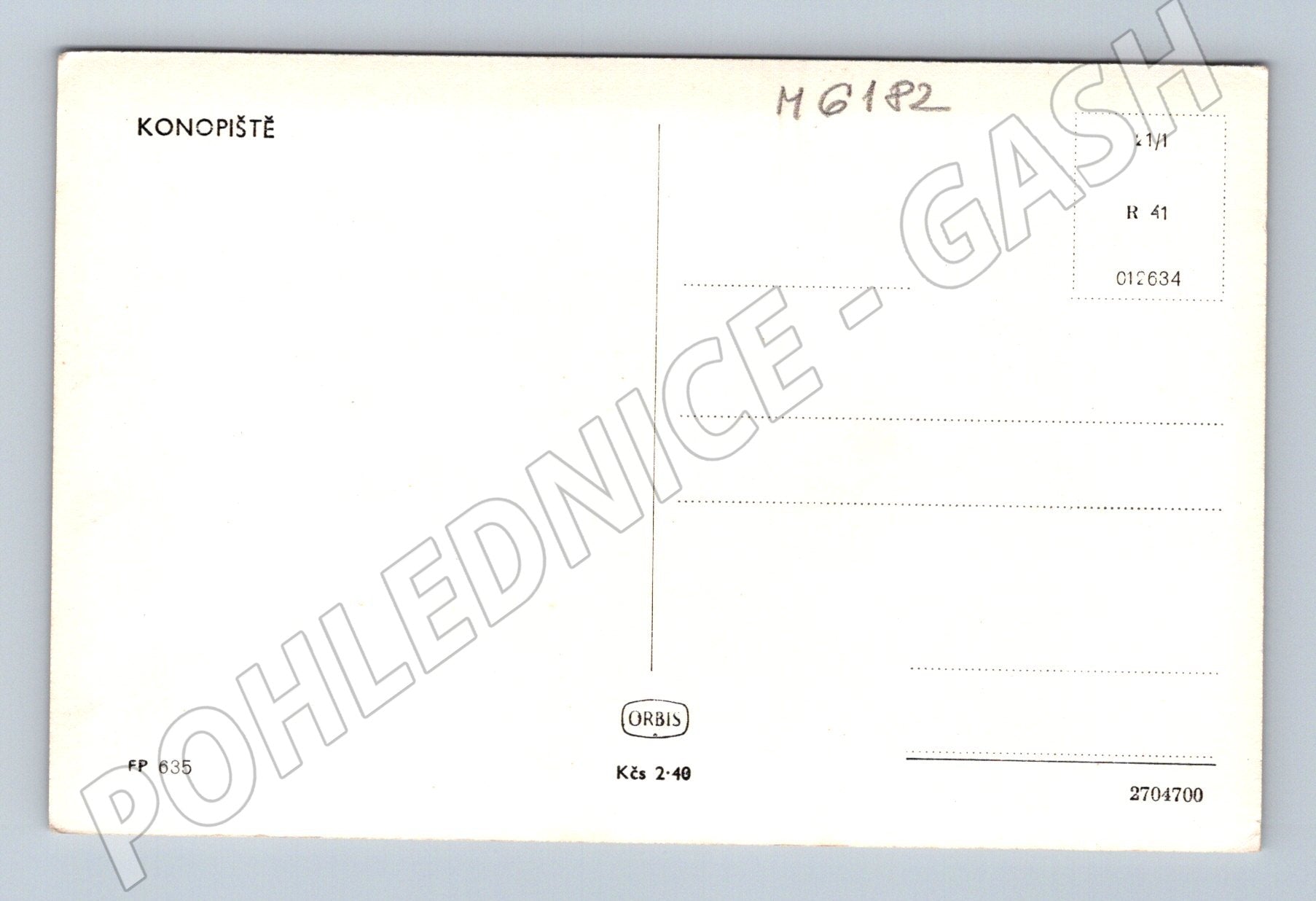 Originální černobílá pohlednice zachycující zámek Konopiště, jeden z nejznámějších českých zámků. Na pohlednici je zámek obklopený krásným parkem a majestátními jehličnany. Jedná se o klasický pohled z období druhé poloviny 20. století. Stav pohlednice je velmi dobrý, bez známek poškození, čistá - nepopsaná, ideální pro sběratele nebo jako historický suvenýr. Zámek Konopiště proslul zejména jako sídlo Františka Ferdinanda d’Este a je vyhledávaným cílem turistů.
